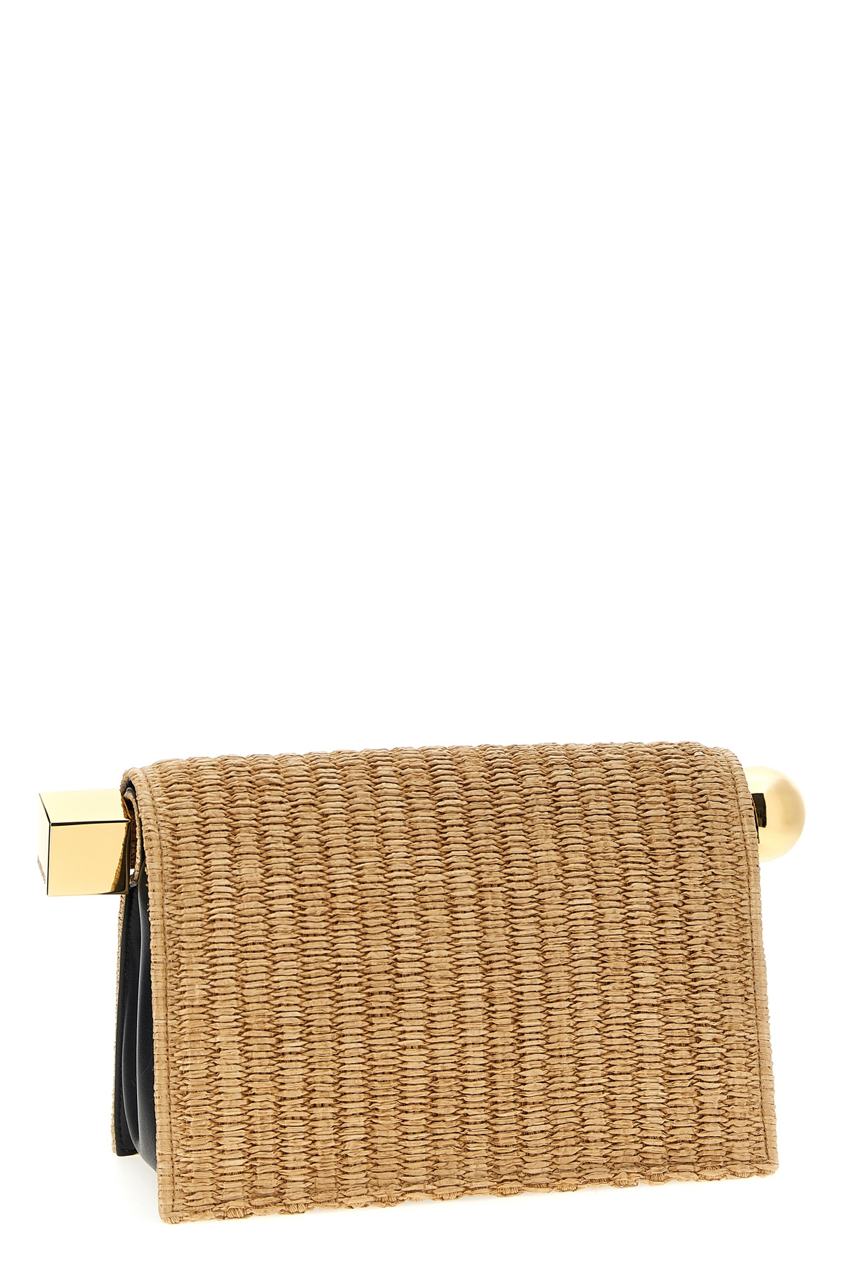 'La Pochette Rond Carre' clutch bag in woven raffia-effect fabric and smooth leather, front metal lettering logo, magnetic closure, metal sphere and cube detail.
