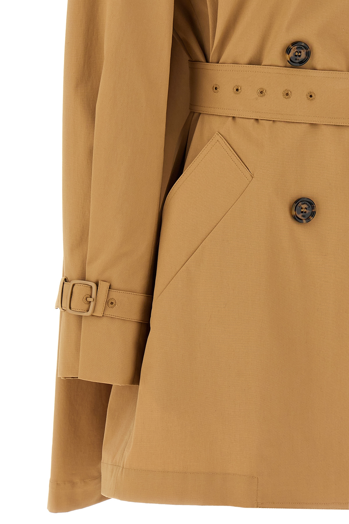 'Landa' raincoat in heavy stretch cotton teardrop canvas, double-breasted model with front button closure, half lined, lapel collar, halberds, long sleeves, asymmetric panel on the back cape effect with belt inserted.