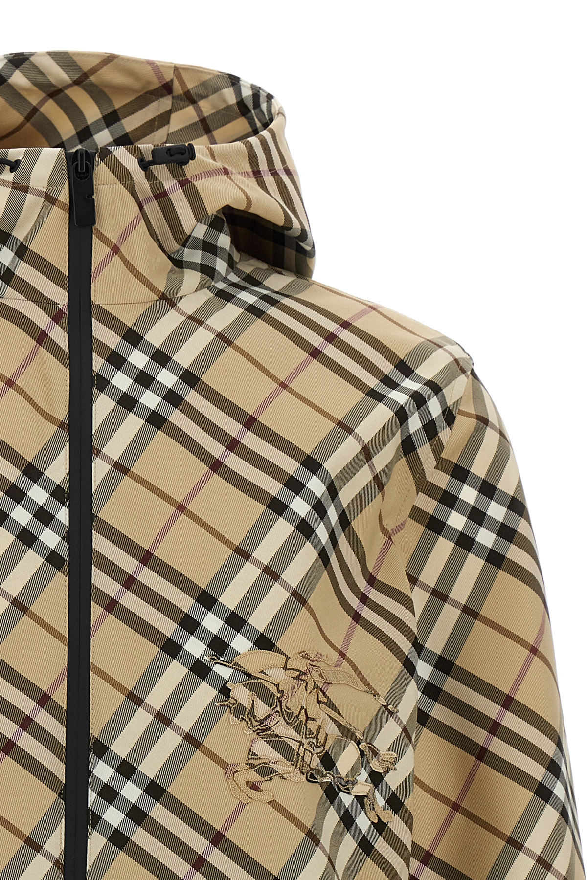 Short hooded jacket, technical fabric with check print, maxi logo embroidery on the front, front zip closure, elastic drawstring on the hem, long sleeves with elastic cuffs.