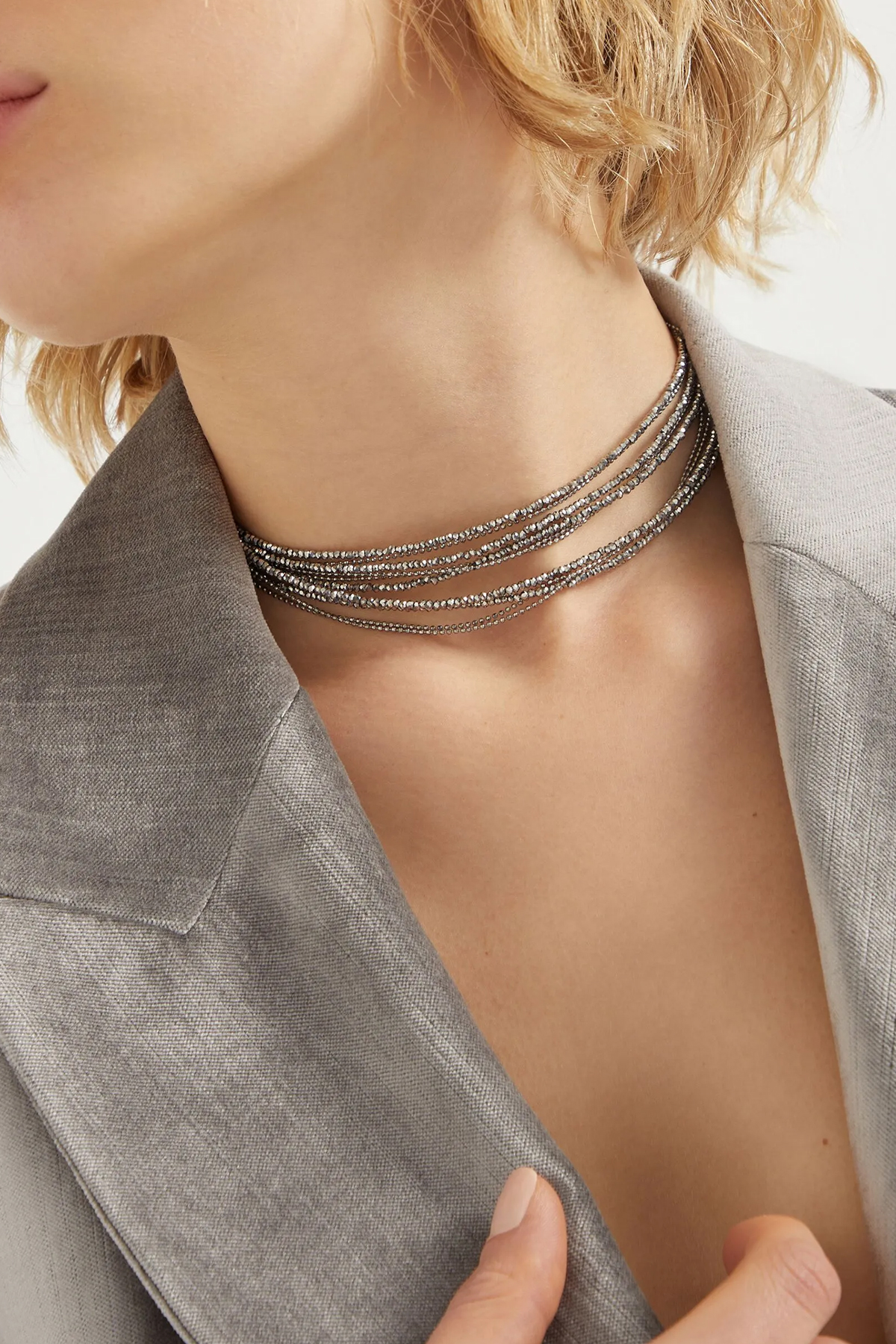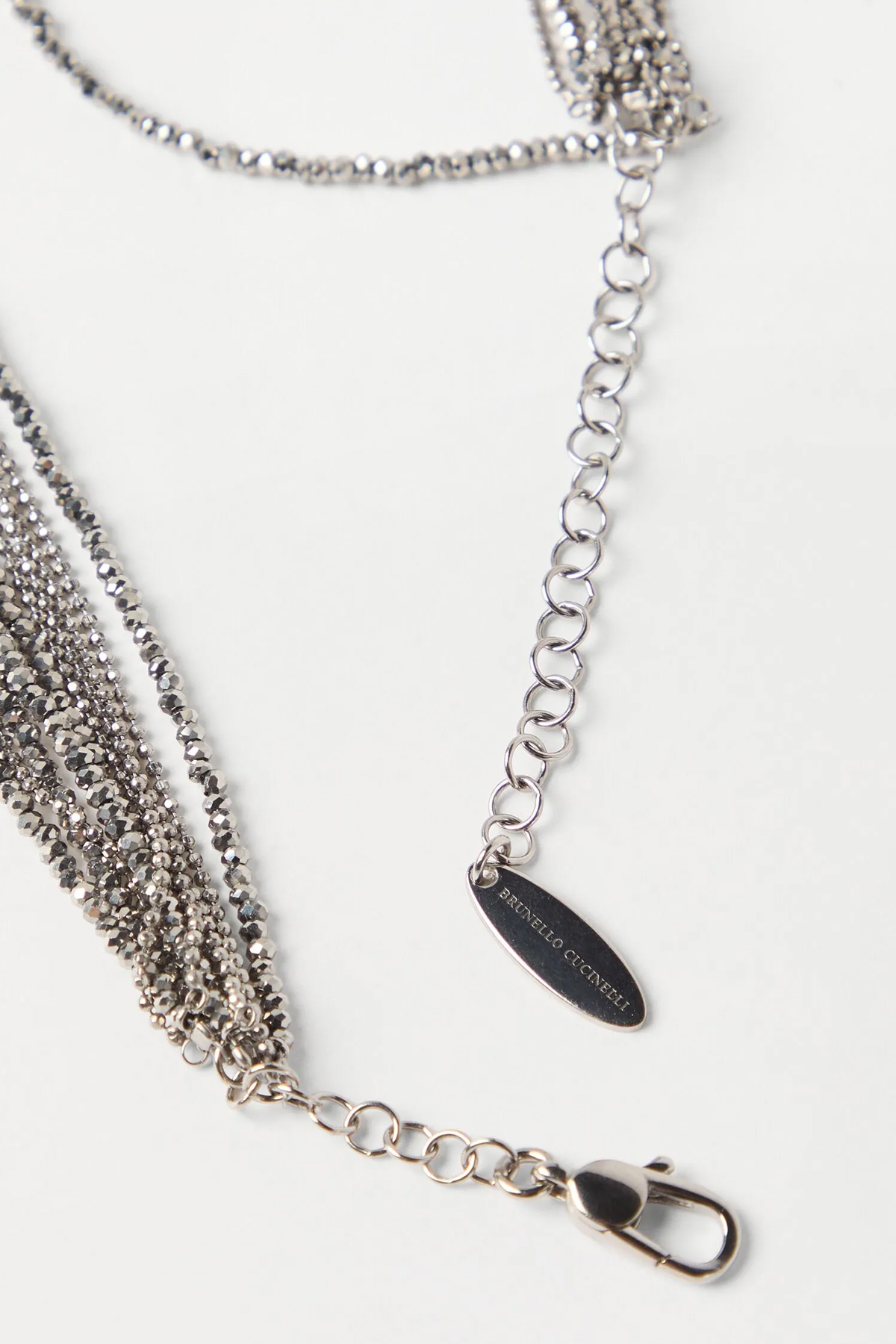 'Monile' necklace in hematite and 925 sterling silver with glass beads, multi-strand, snap hook closure, adjustable.