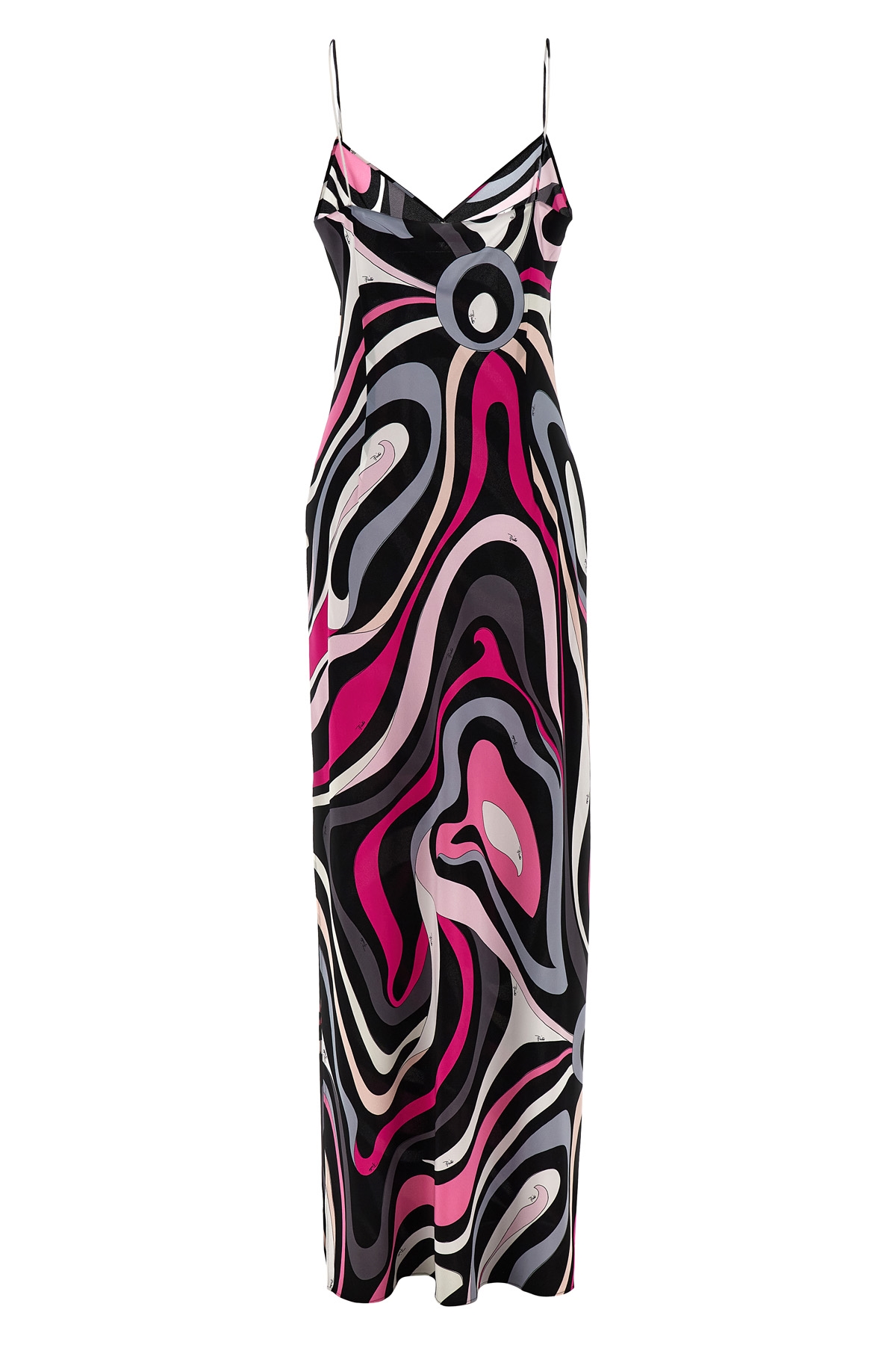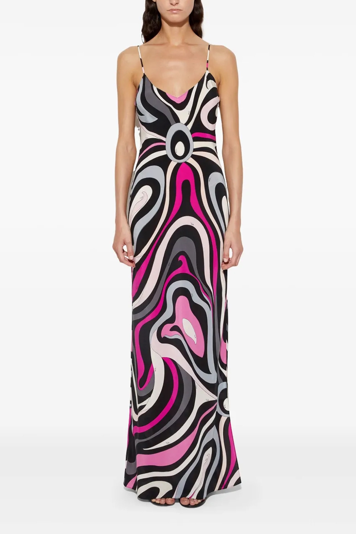 Long dress in marble print silk crepe de chine with V-neck, sleeveless with thin straps, and side split.