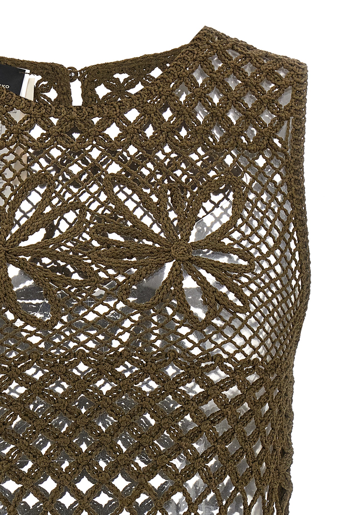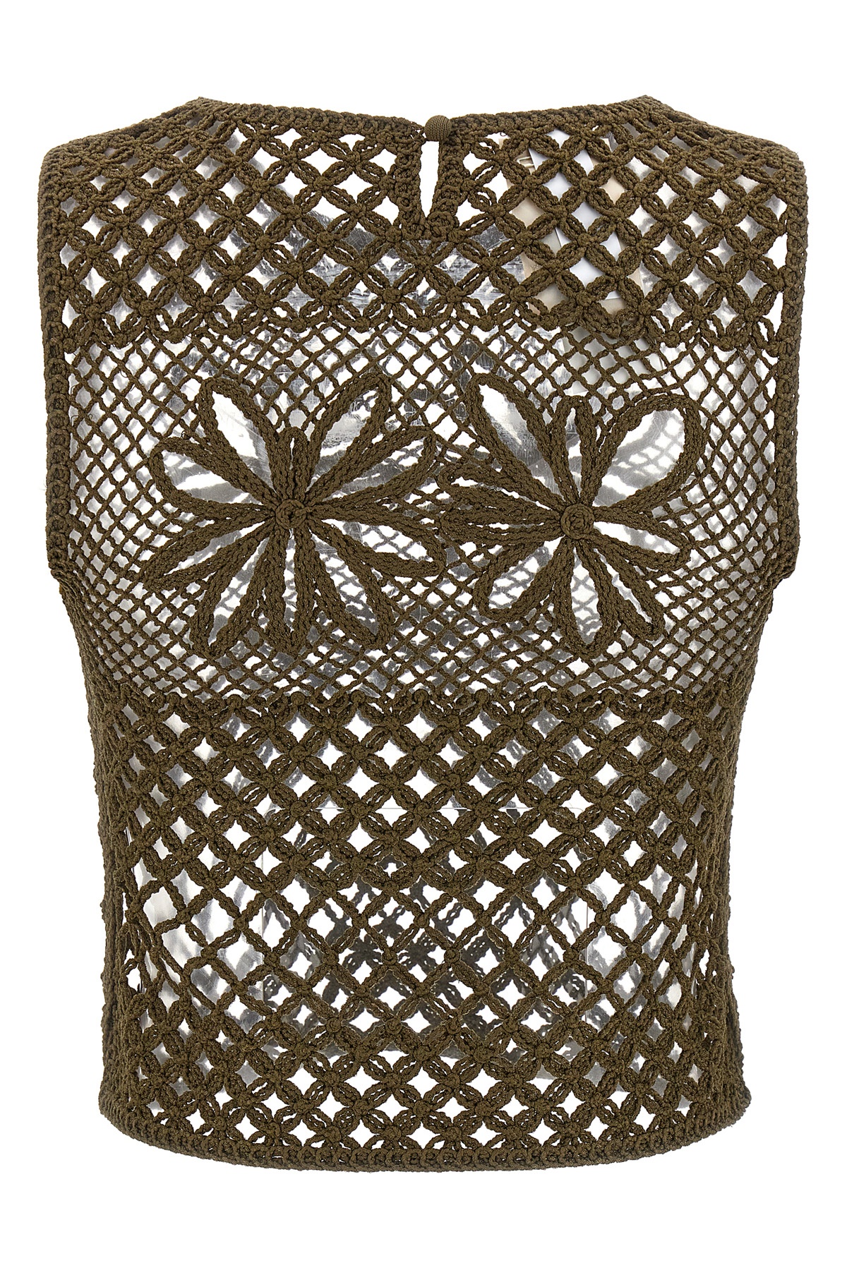 'Gonzano' top in perforated crochet mesh yarn with wide weft, crew neck, back button closure.