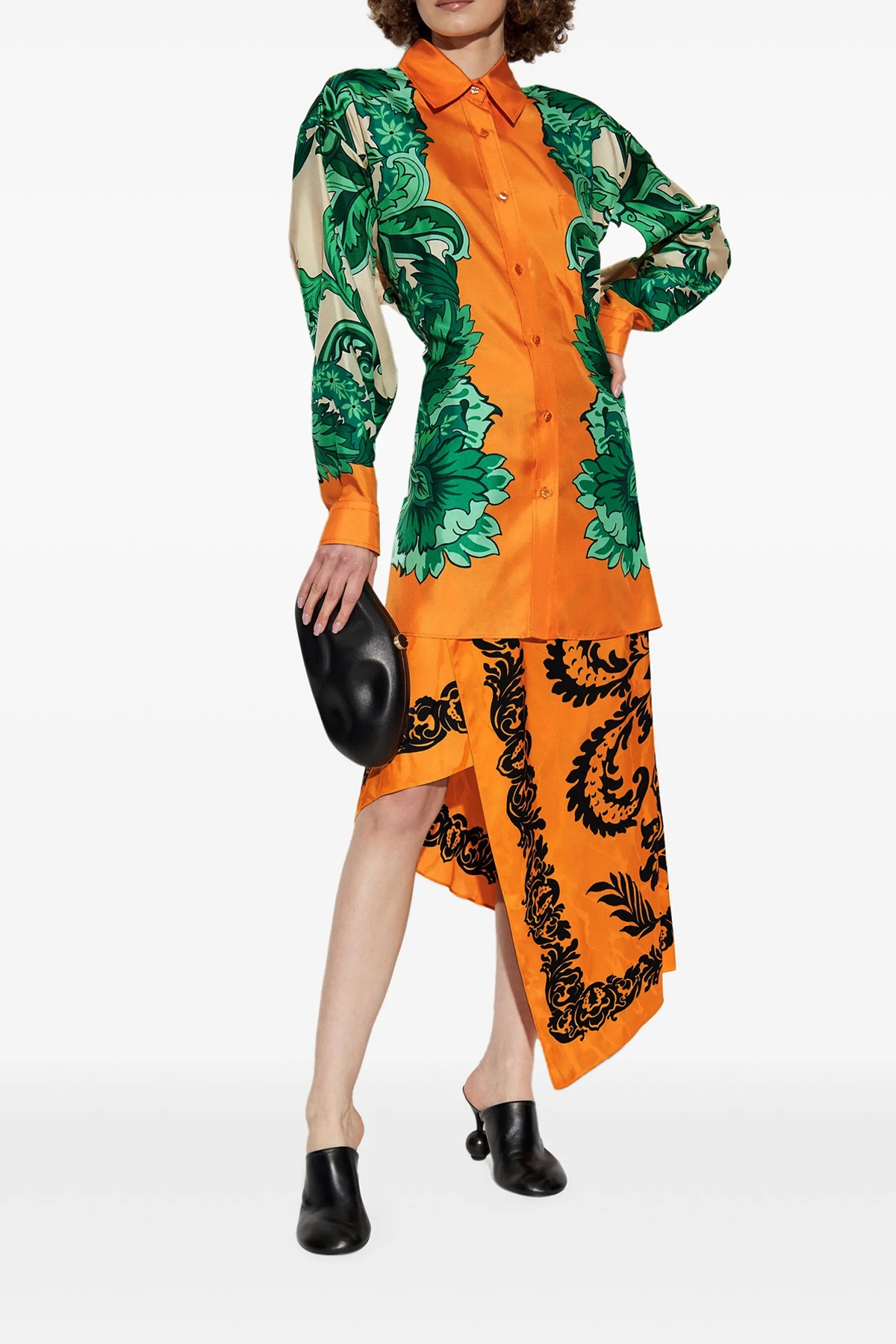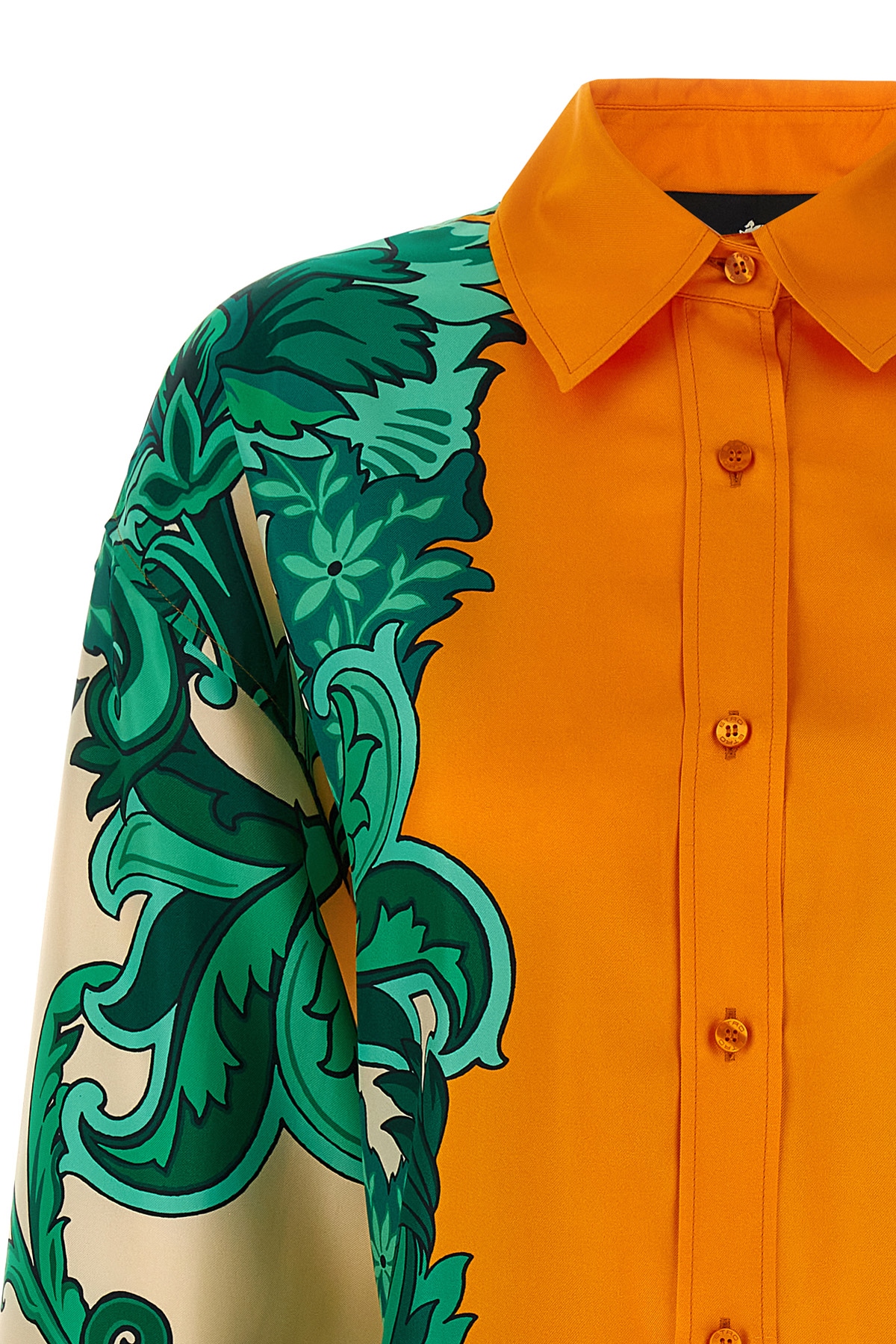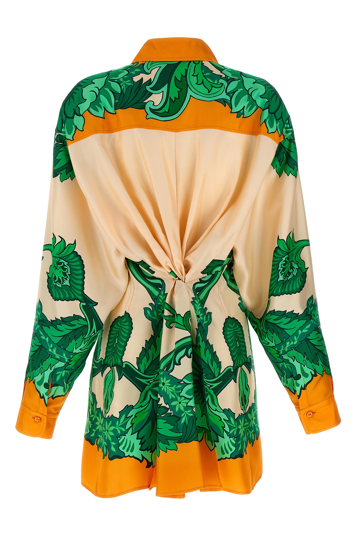Pure silk twill shirt with maxi floral floral print inspired by scarf, sidecut model with scarf detail and back knot, front button closure, breast pocket, long cuffed sleeves.