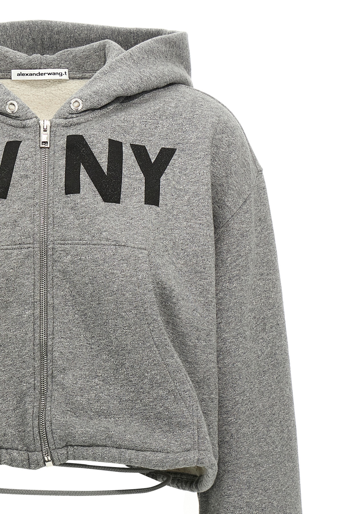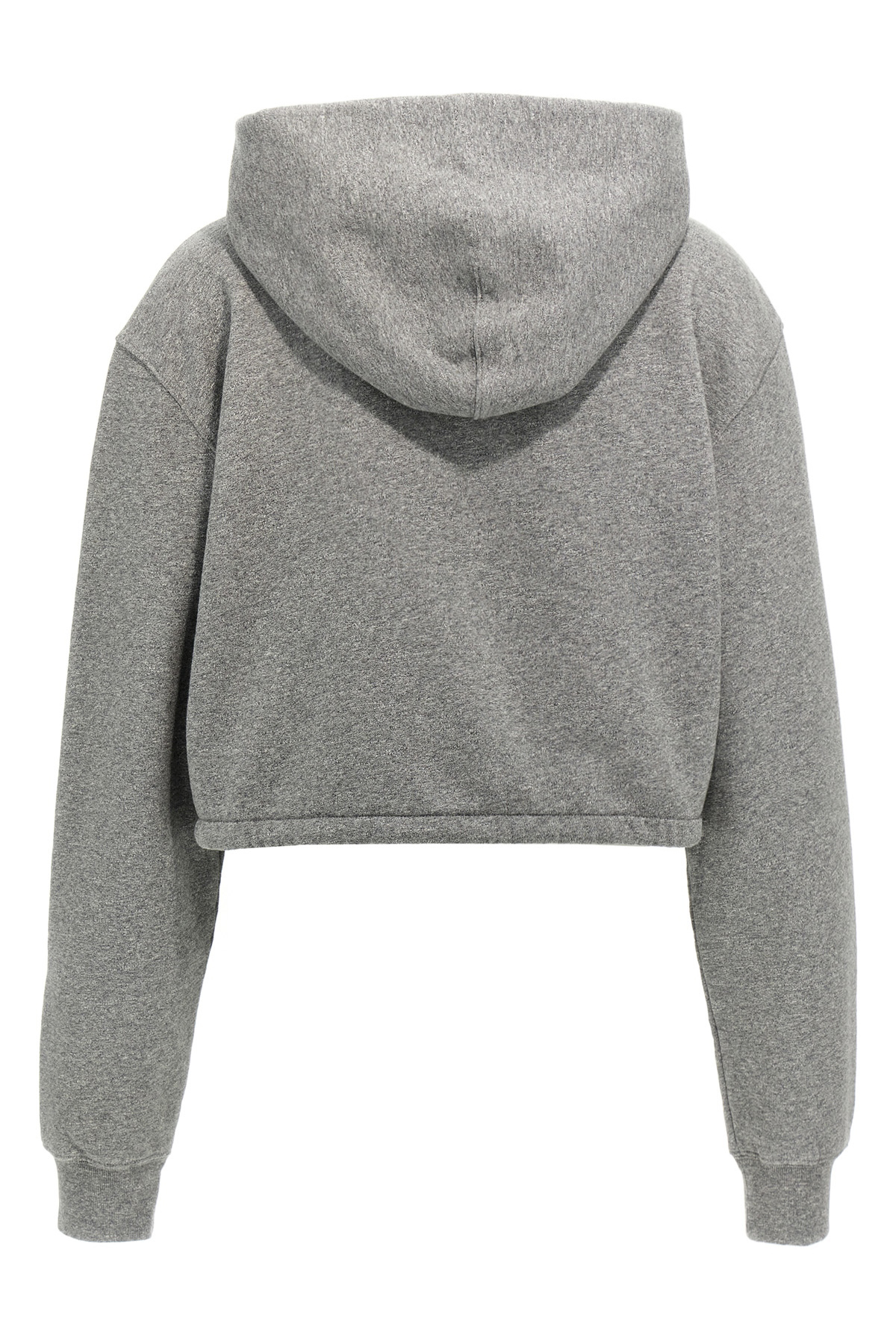 Hoodie in fleece cotton, deconstructed crop wallet model with drawstring on the hem, print and front zip closure, pockets, long sleeves with cuffs and dropped shoulder.