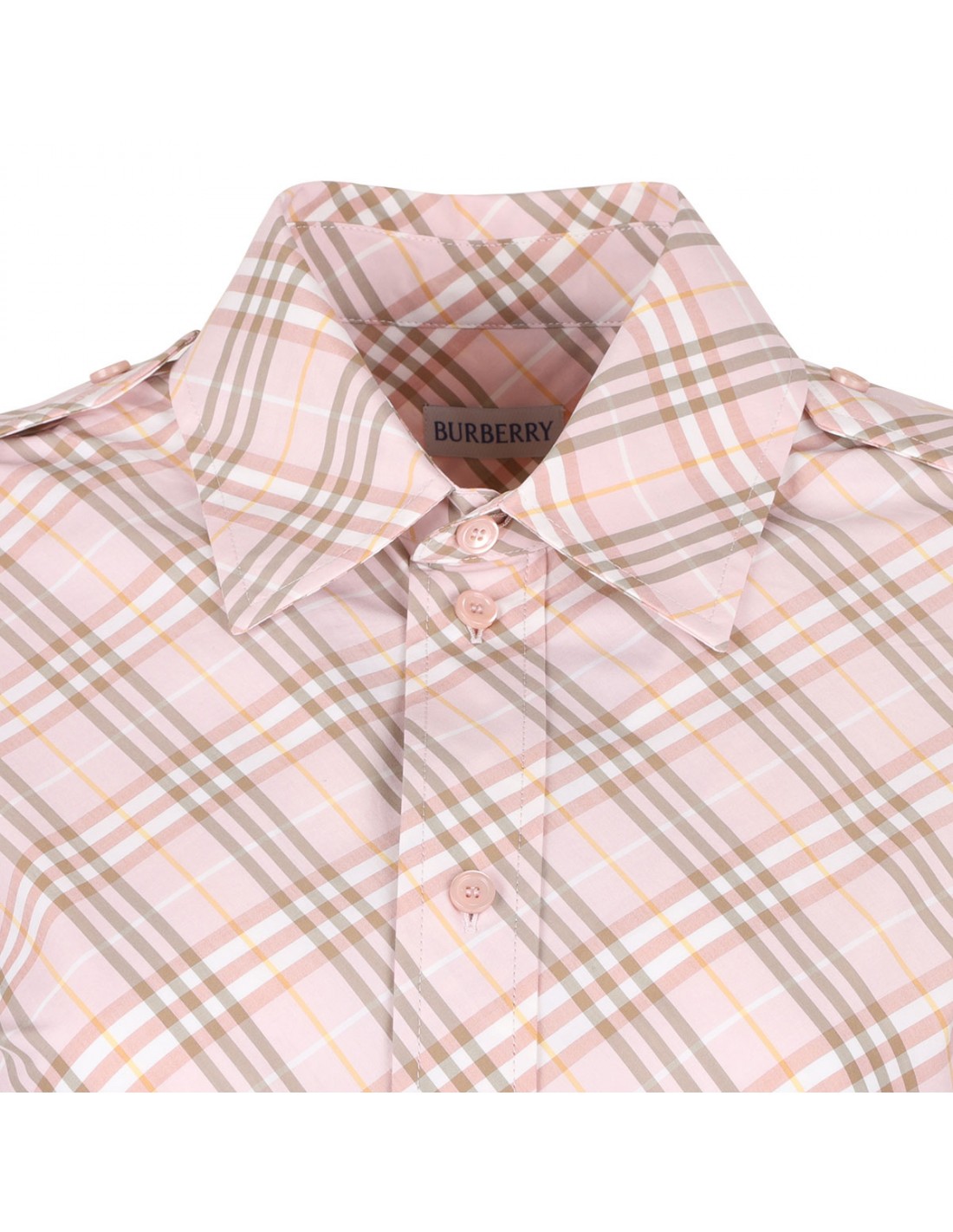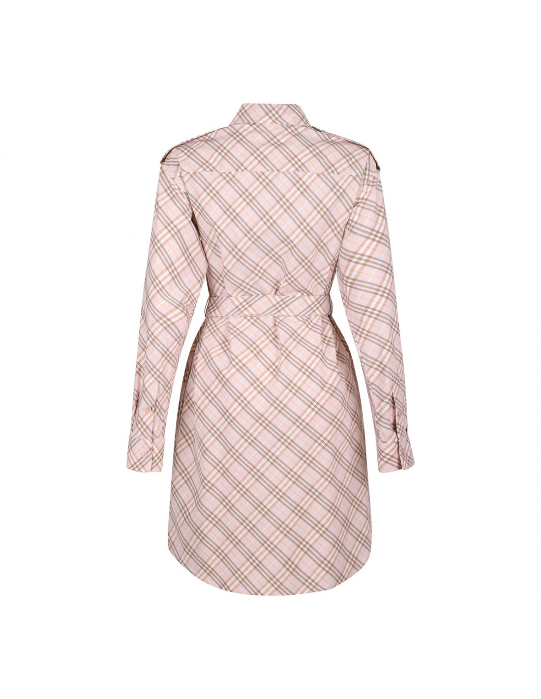 Pink cotton shirt dress from Burberry featuring iconic check motif, regular fit, shoulder epaulettes, adjustable belt with B buckle at waist, button closure on front, pointed collar, side slip pockets, curved hem.