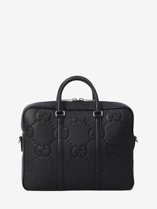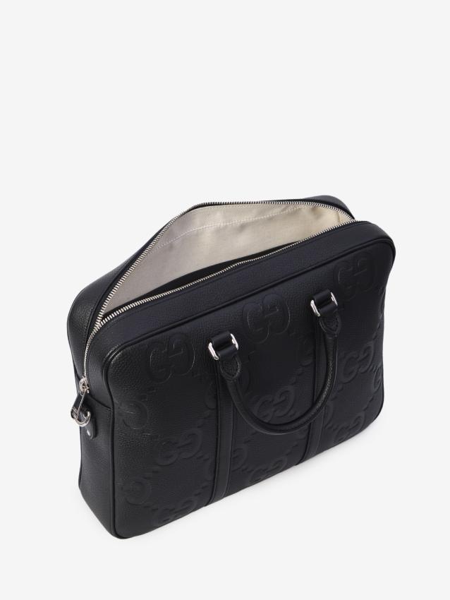 Document holder in black jumbo GG leather with black leather trims. It features two top handles, a zip closure with dual zipper pulls, a removable