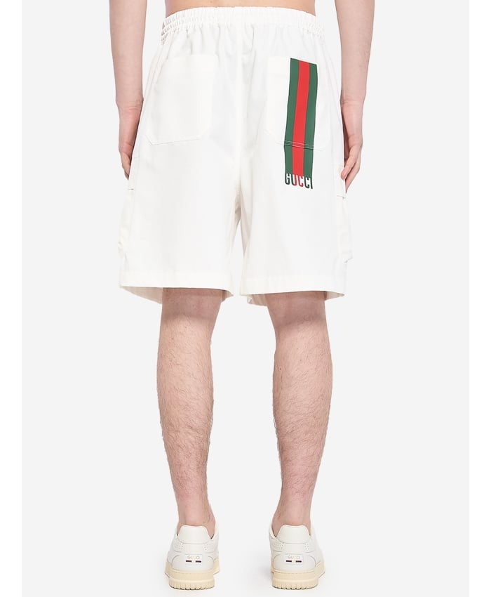 Texturized cotton bermuda shorts in white. They feature an elasticated waistband with a drawstring, two side slash pockets, two cargo pockets with