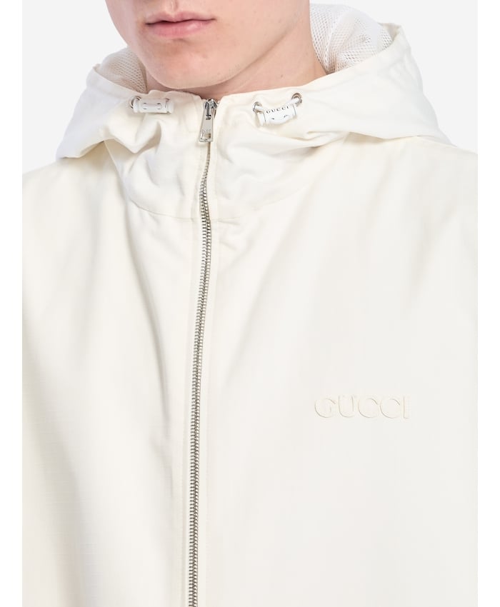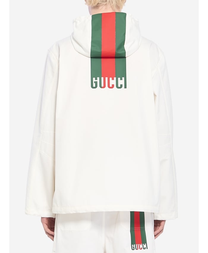 Hooded jacket in textured white cotton. It features a drawstring hood with a green and red Web detail and a Gucci logo extending across the back, a