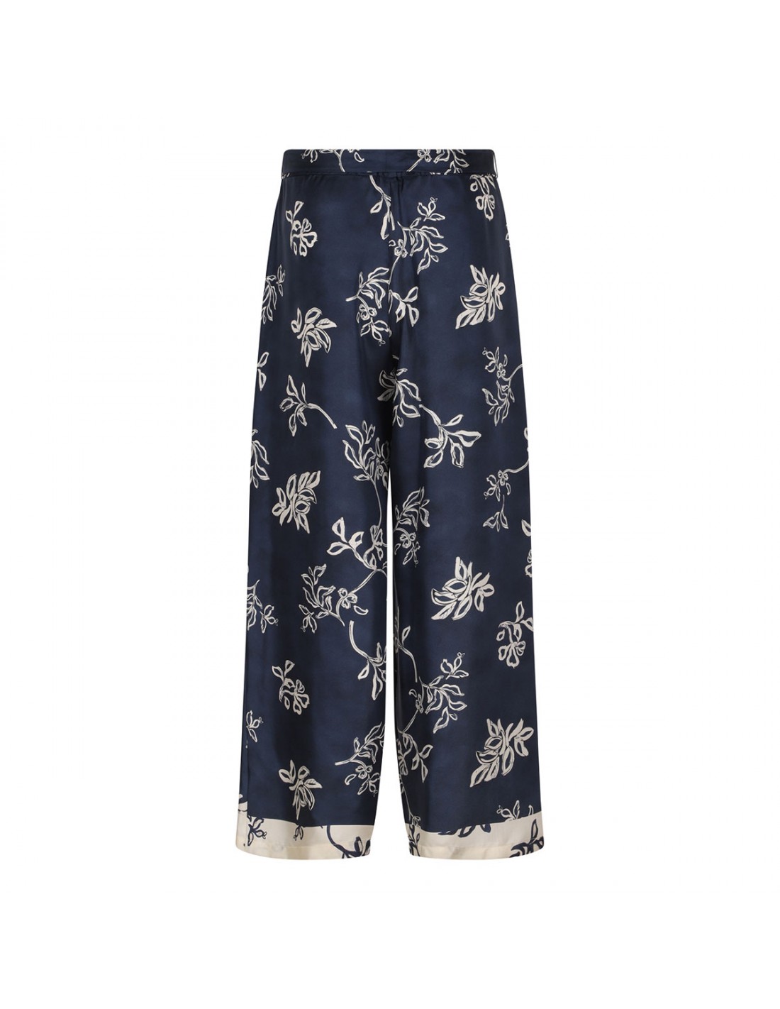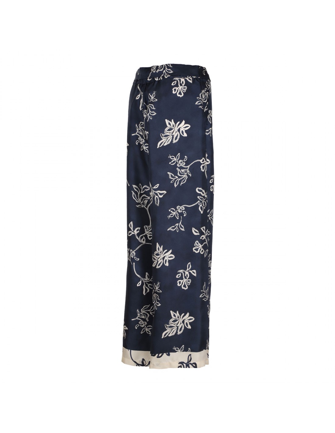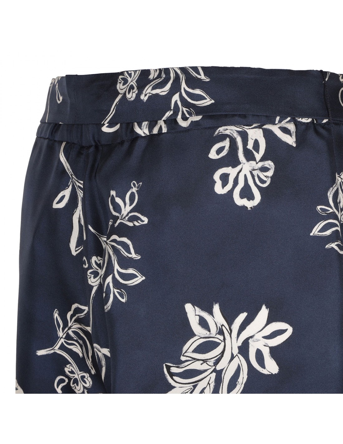 Marine blue silk twill Cinzia pants from 'S Max Mara featuring all-over printed floral motif, straight-cut, loose-fit, contrasting band on hem, elasticated waist at back, side pockets, matching belt, tab, zip fly and small hook fastening.
