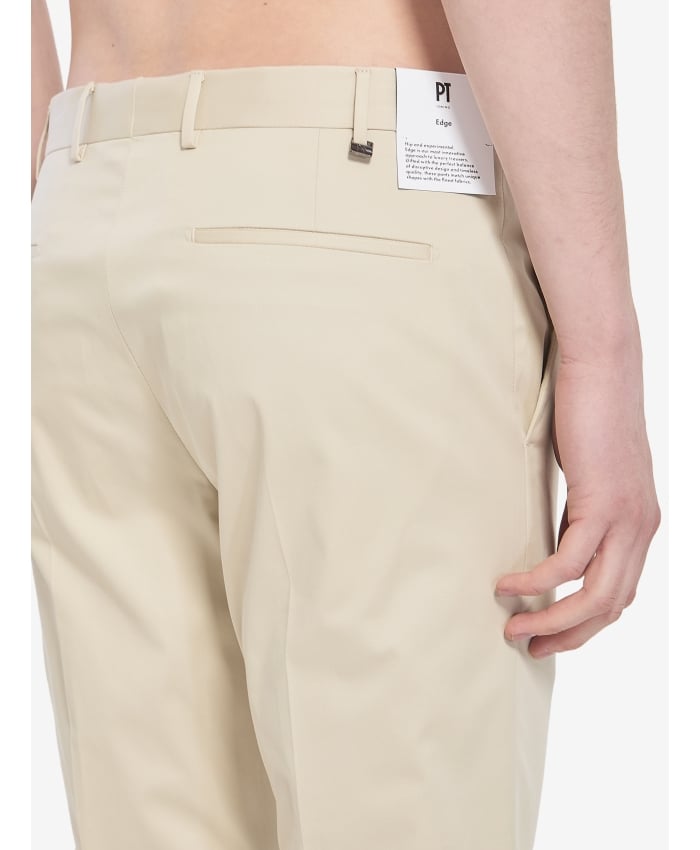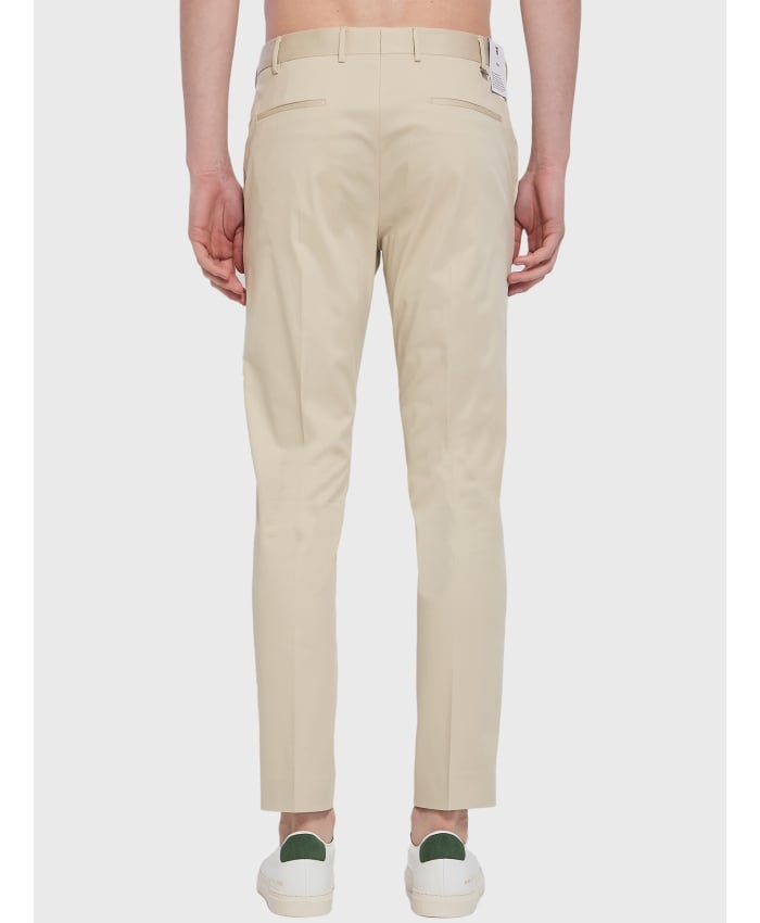 Dieci trousers in beige cotton blend. They feature a hook, button, and zip closure, belt loops, two side pockets, and two back pockets. Super slim