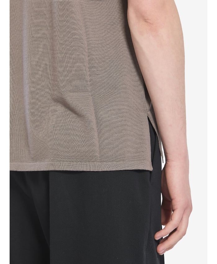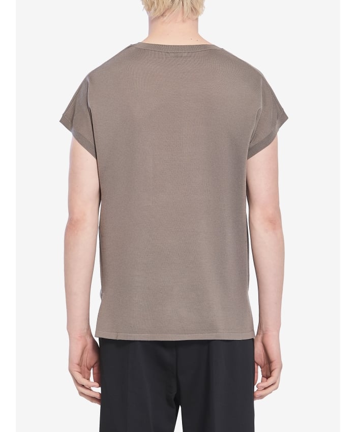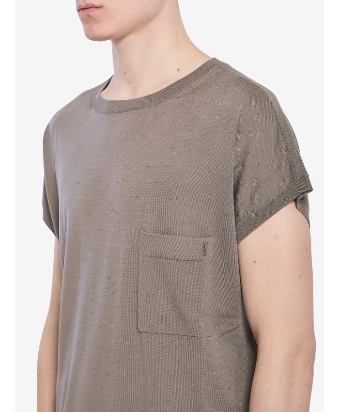 Grey short-sleeved crewneck t-shirt in wool. It features a patch pocket on the chest and ribbed crewneck and sleeve hems. The model is 189cm tall and