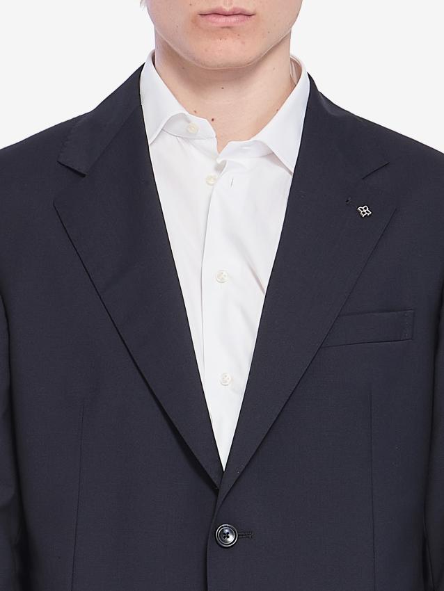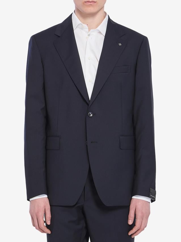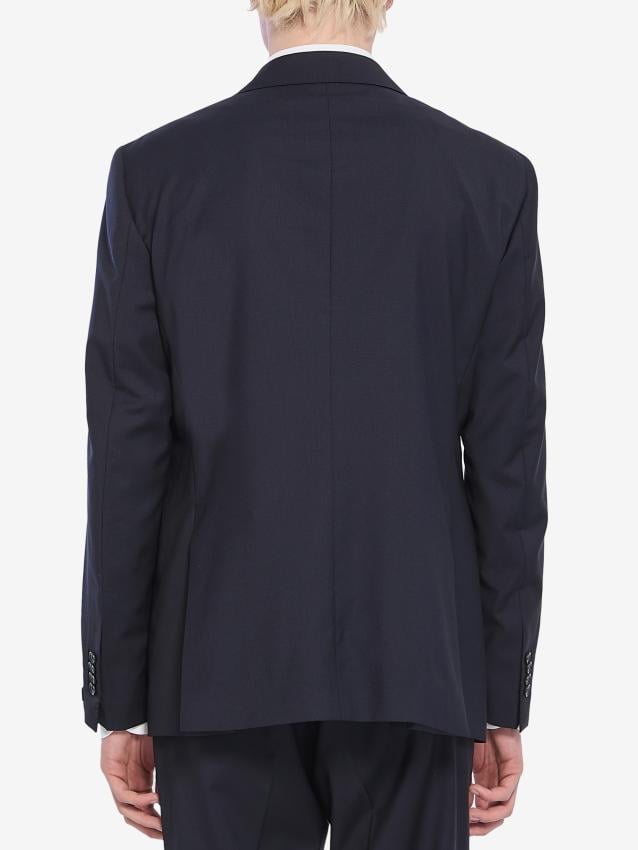 Two-piece suit in dark blue virgin wool. The jacket features a single-breasted design with classic lapels and a pin on the collar, front button