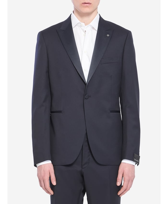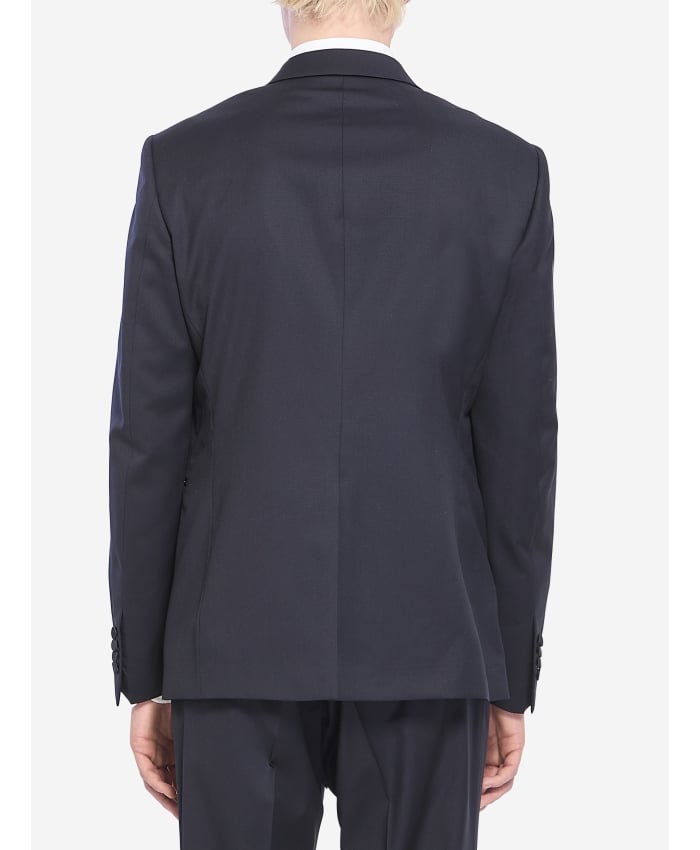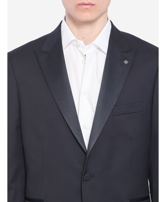 Two-piece suit in dark blue virgin wool. The jacket features a single-breasted design with classic satin lapels and a pin on the collar, front button