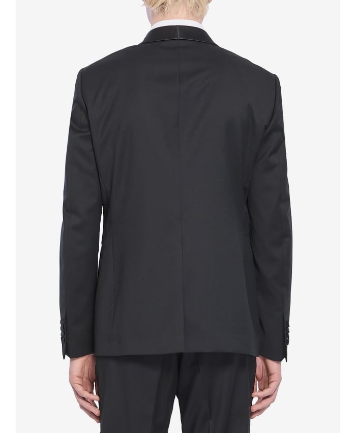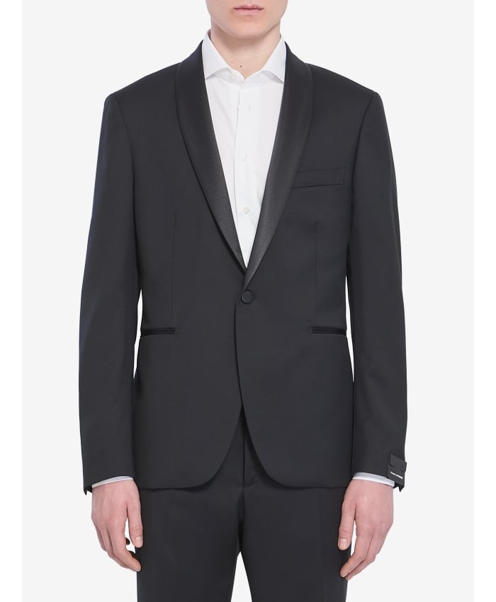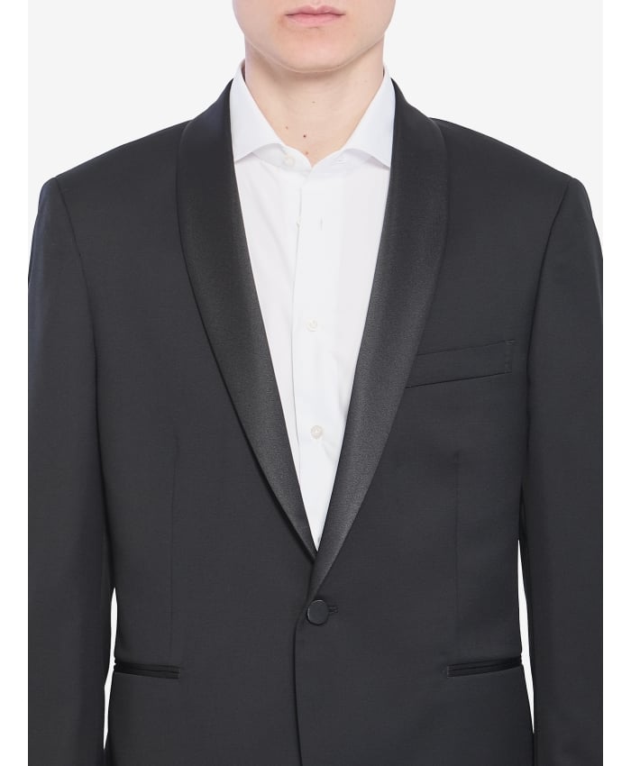 Two-piece suit in black virgin wool. The jacket features a single-breasted design with classic satin lapels and a pin on the collar, front closure