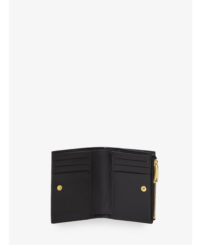 Black lambskin leather wallet with all-over Intrecciato motif. It features snap-button closure, one zip pocket, one bill compartment, six card slots