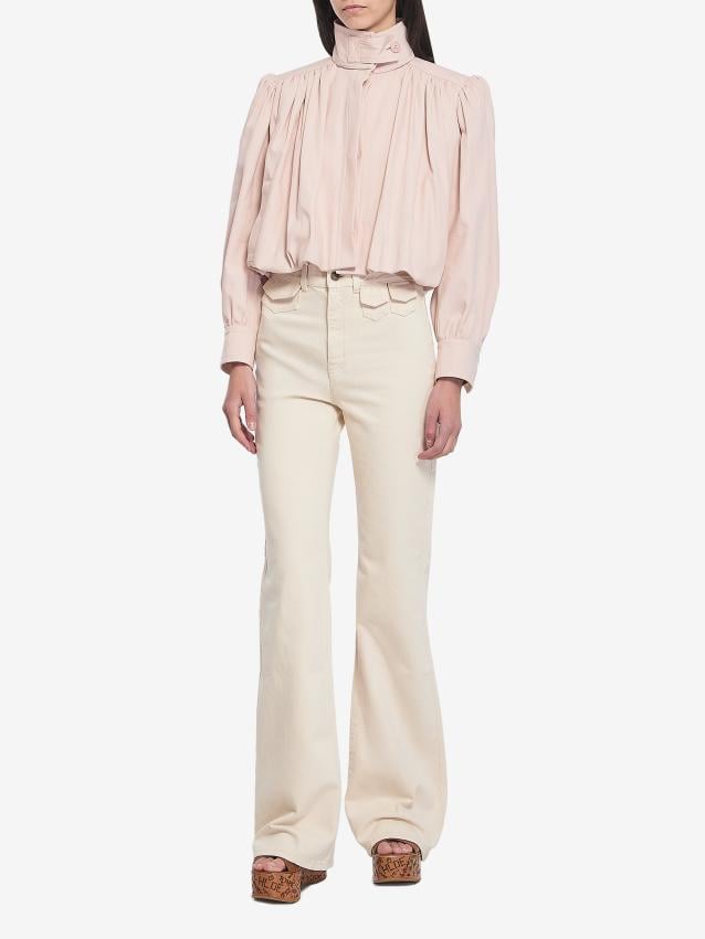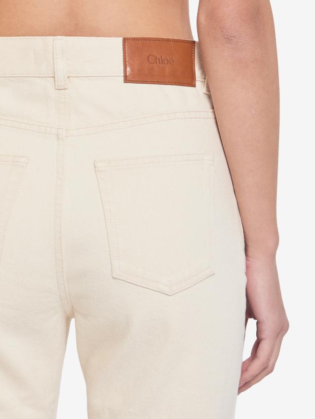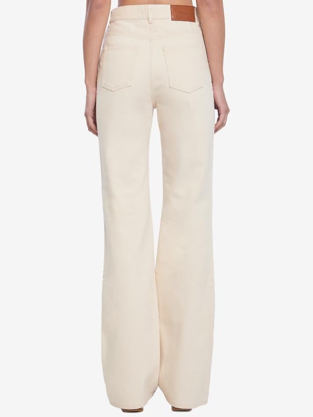 High-waisted flare jeans in Eden White cotton denim. They feature a button and zip closure, belt loops, three mini flap pockets at the front waist,