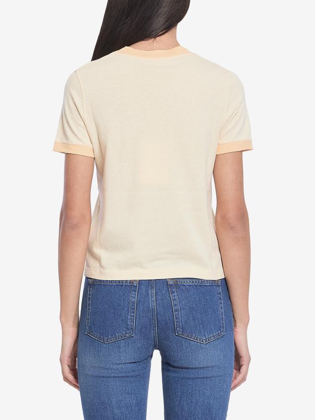Short-sleeved crew-neck t-shirt in yellow cotton jersey. It features a chest pocket with a black printed logo, and light orange ribbed trims on the