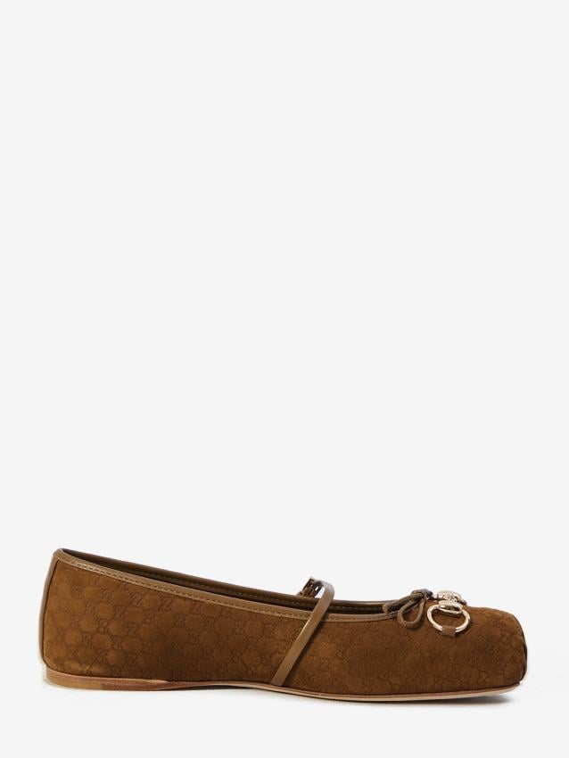 Ballet flats in light brown mini GG suede leather with a light gold-tone metal Horsebit on the toe. They feature a leather bow on the toe, leather
