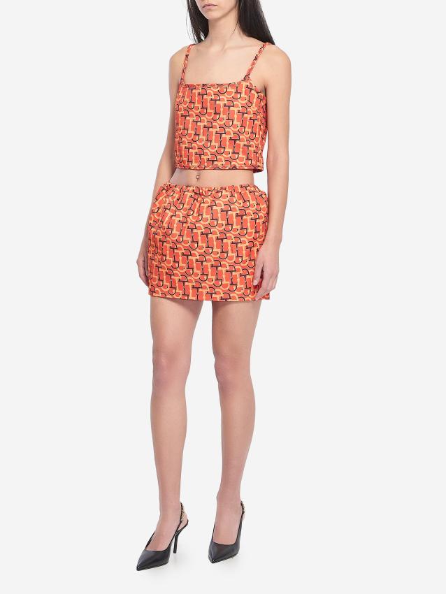 Mini skirt in rigid cotton with Gucci Rosso Ancora red and orange Horsebit print. It features an elasticated waist.The model is 179cm tall and wears