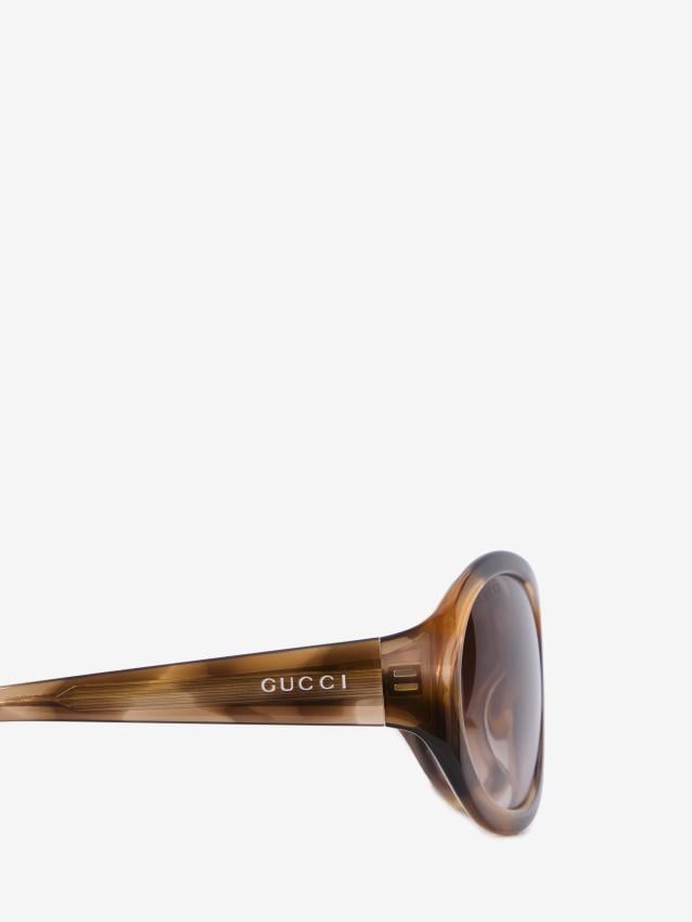 Round sunglasses with a glossy tortoiseshell acetate frame. They feature transparent brown tortoiseshell acetate temples with an enameled logo and