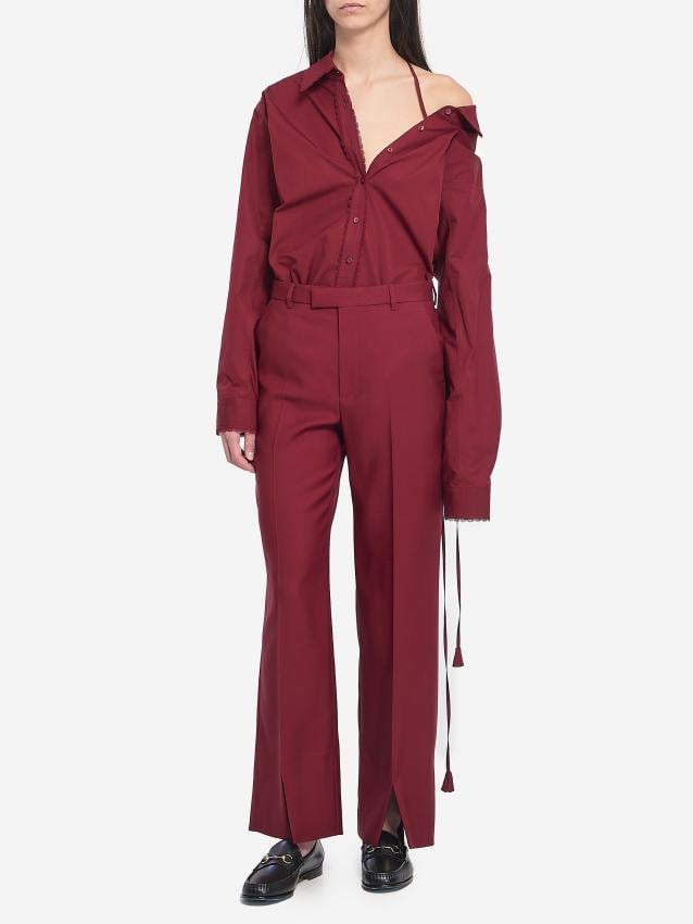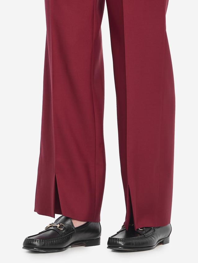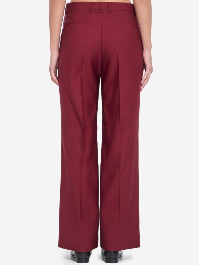 Tailored low-rise trousers in lightweight Gucci Rosso Ancora red wool. They feature a button, hooks, and zip closure, belt loops, two side pockets,