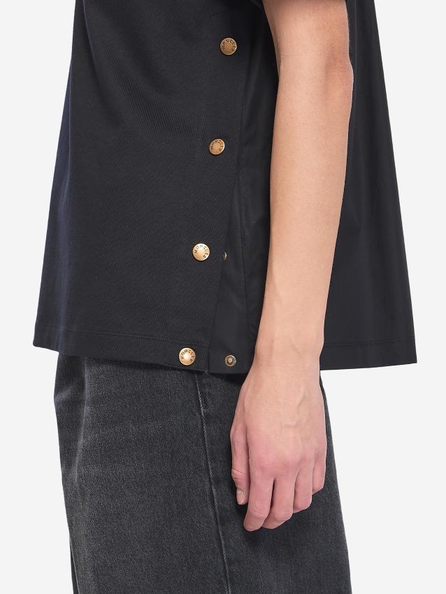 Crew-neck t-shirt in black cotton jersey with short sleeves. It features a patch pocket on the chest, side openings with logo snap buttons, a Moncler