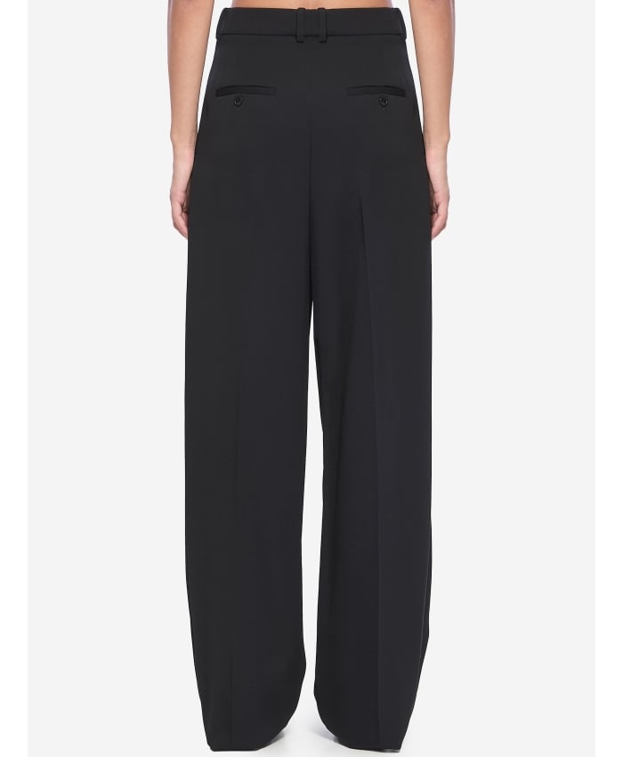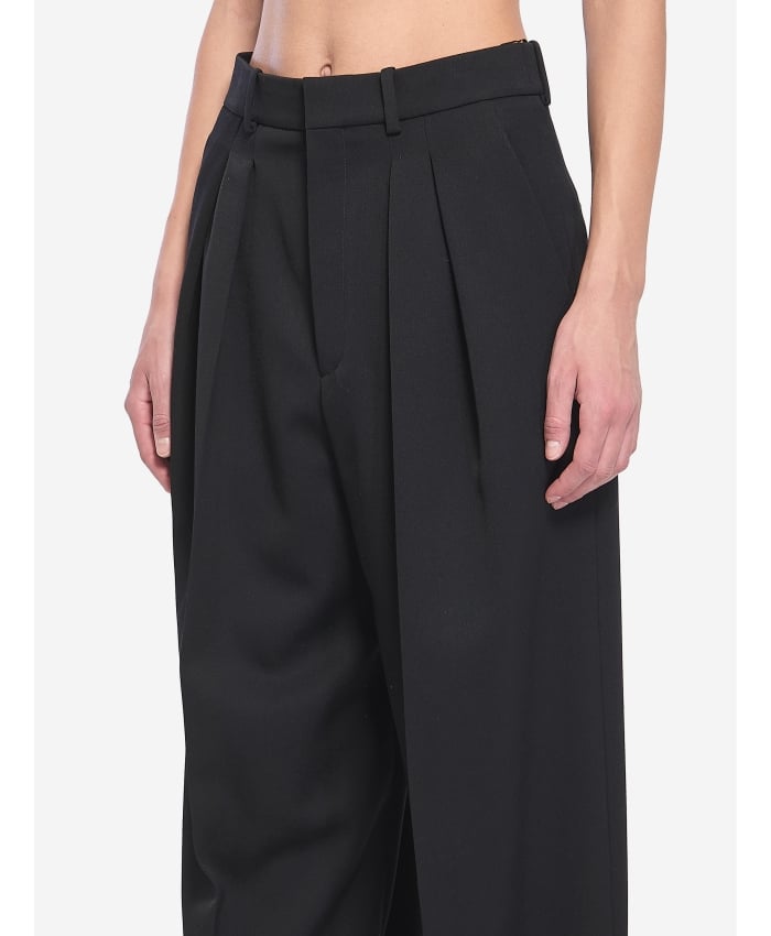 High-waisted tailored trousers in black wool. They feature a concealed closure with a button, hooks, and zip, double pleats, two front slanted