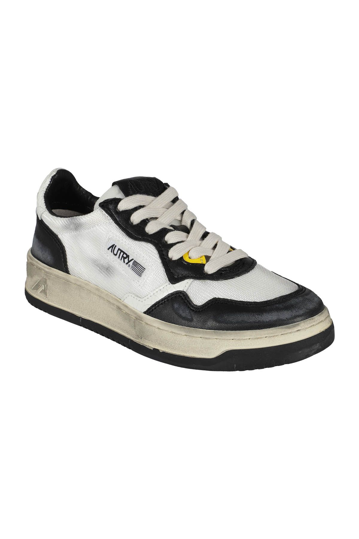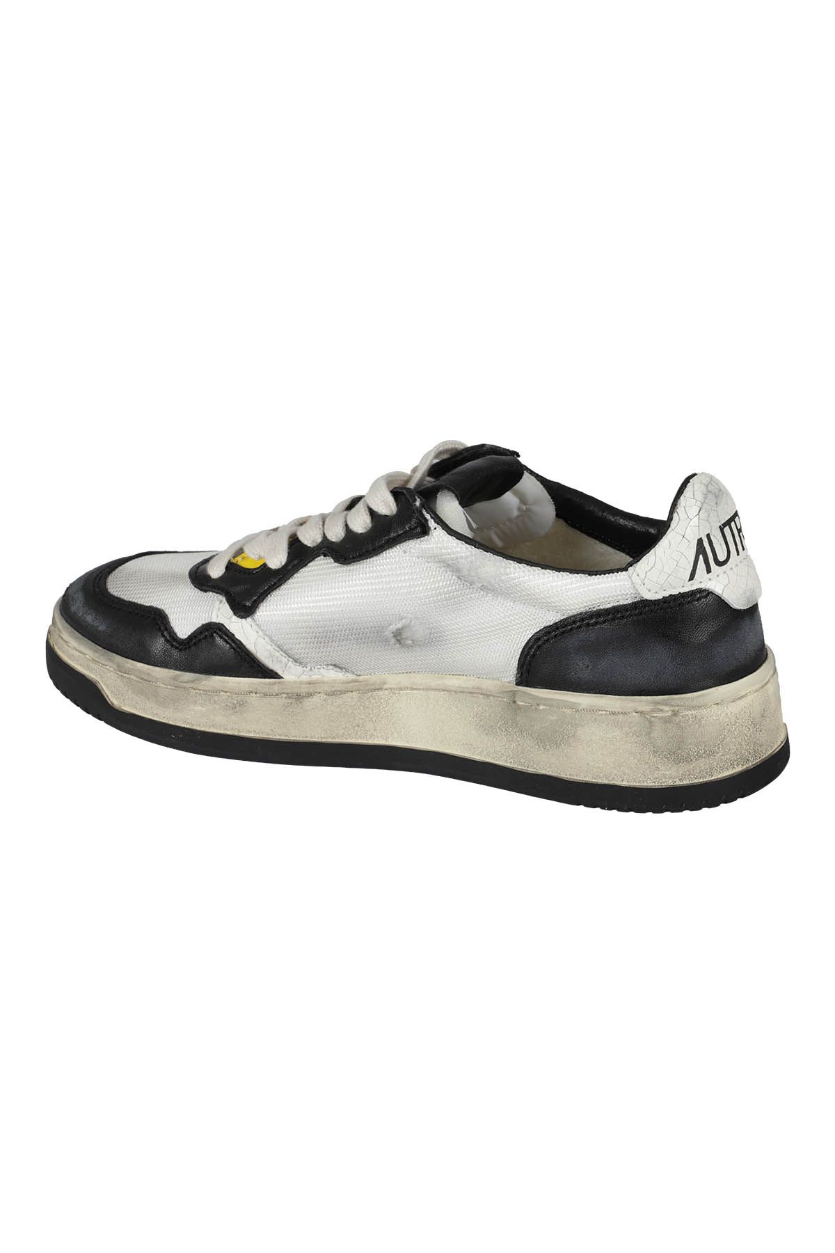 White genuine leather sneakers with contrasting black metallic details by Autry, Super Vintage Low Wom model, round toe design, cotton laces, genuine leather upper, contrasting black rubber sole, iconic logo of the band