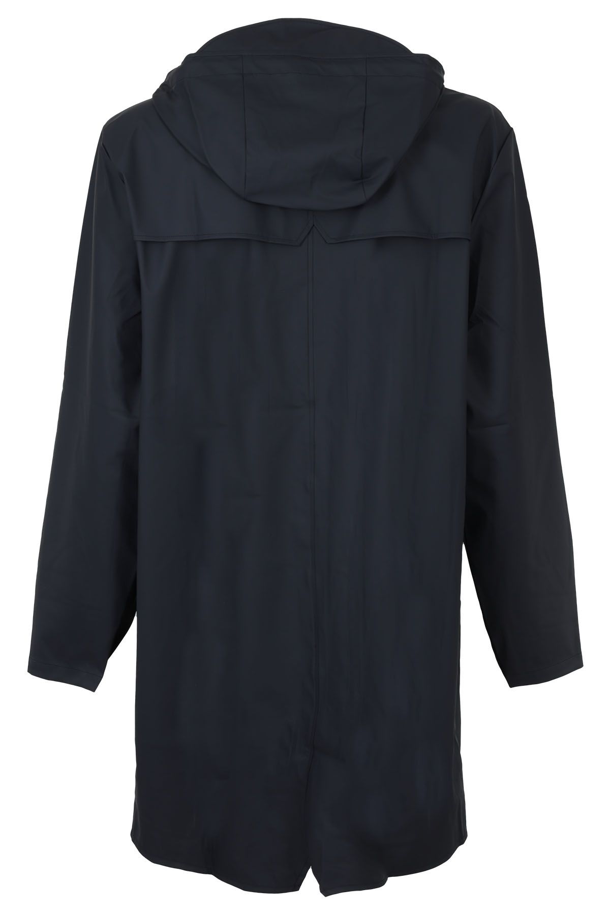 Rains Long Raincoat, navy blue, hood with visor, long sleeves, front button fastening, side pockets.