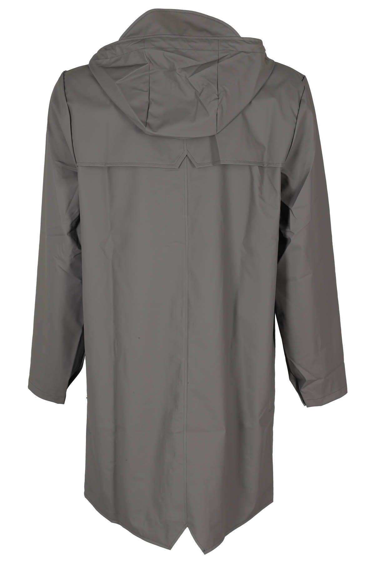 Rains Long Raincoat, grey, hood with visor, long sleeves, front fastening with buttons.