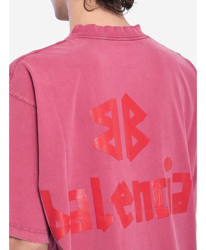 Raspberry-colored worn-effect cotton dry jersey short-sleeve crewneck t-shirt. It features a Tape Type motif in red on the front and back, and a