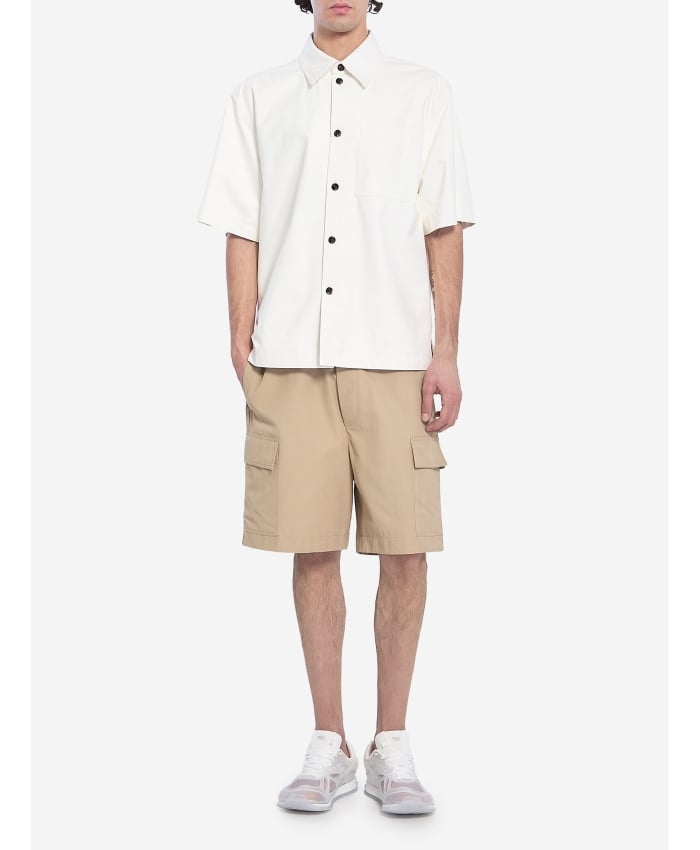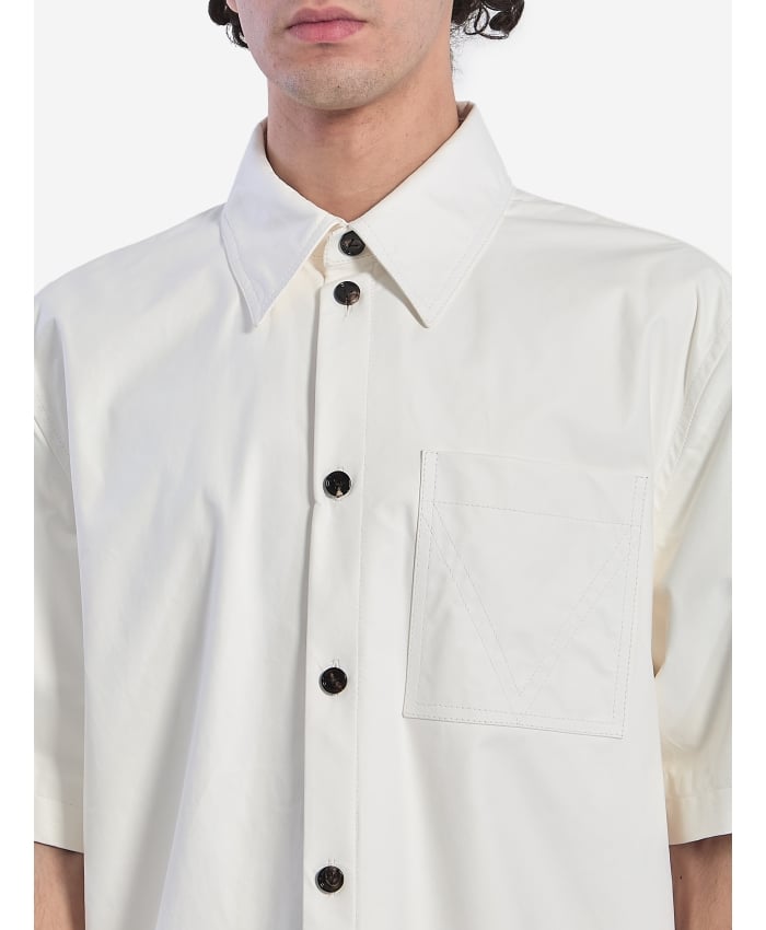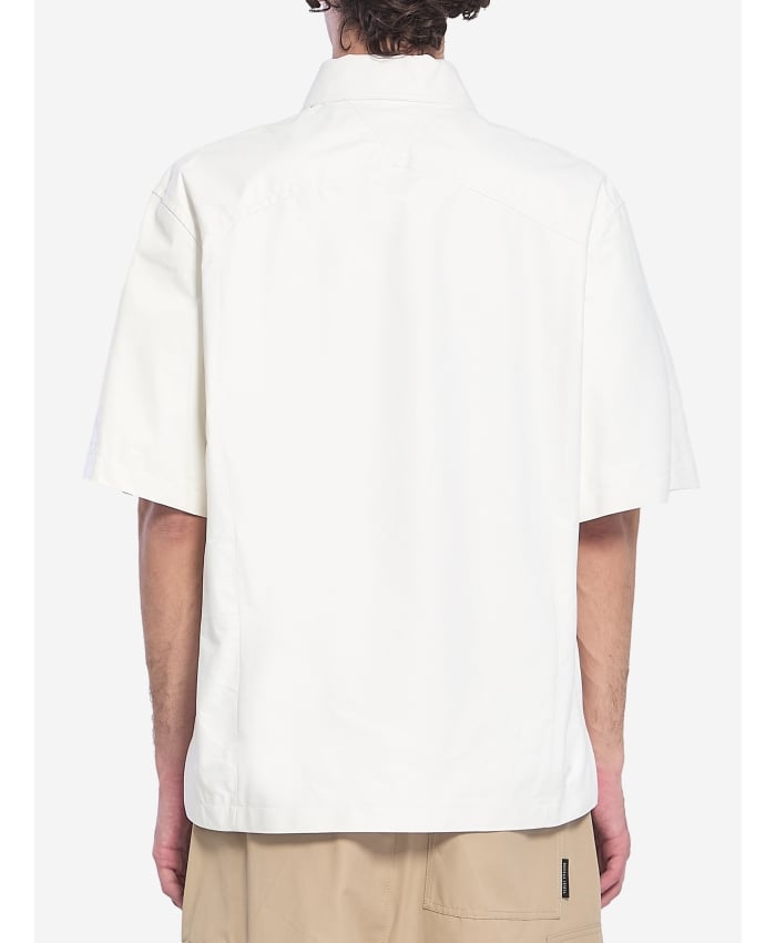 Short-sleeve shirt in white lambskin. It features a pointed collar, front button closure, a patch pocket on the chest with V-shaped stitching detail,