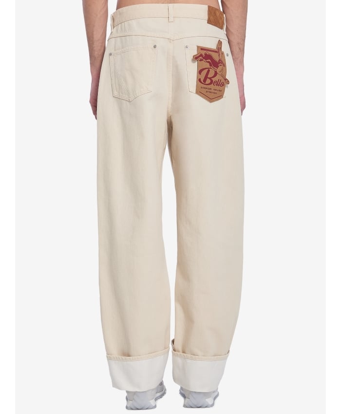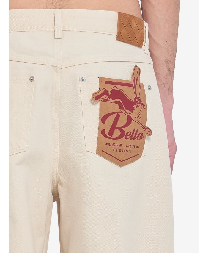 Jeans in meringue white cotton denim. They feature a button closure, belt loops, five pockets, a removable rabbit patch on the right back pocket, a