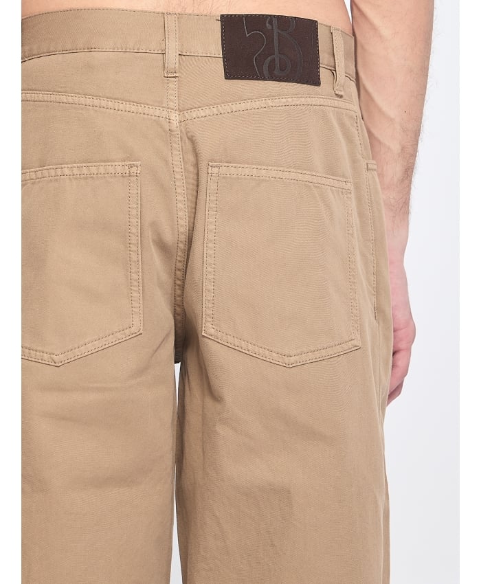 Tobacco-colored washed cotton twill trousers. They feature a button and zip closure, five pockets, belt loops, a dark brown suede patch with a B