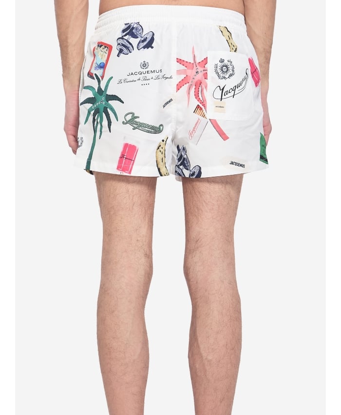 White Puntini swimsuit with all-over Jacquemus Cruise print. It features an elasticized waist with drawstring, a fake fly with two buttons, two side
