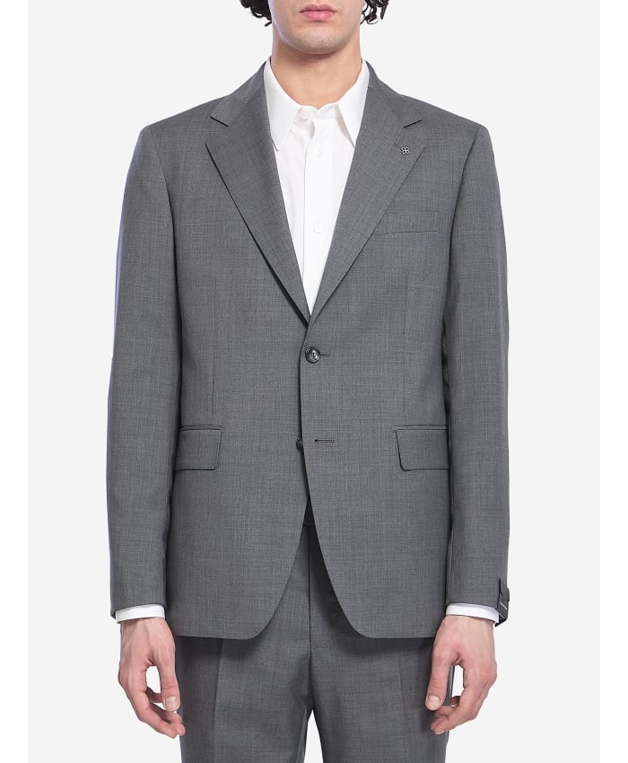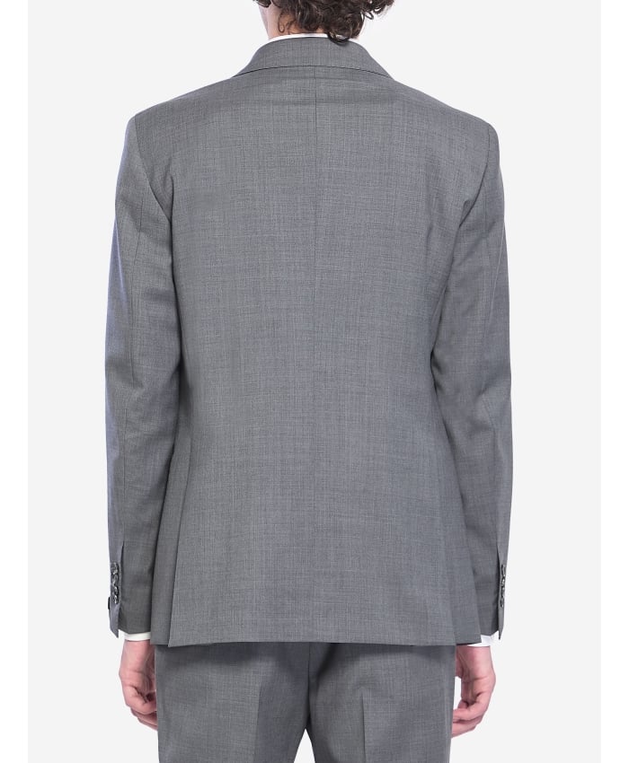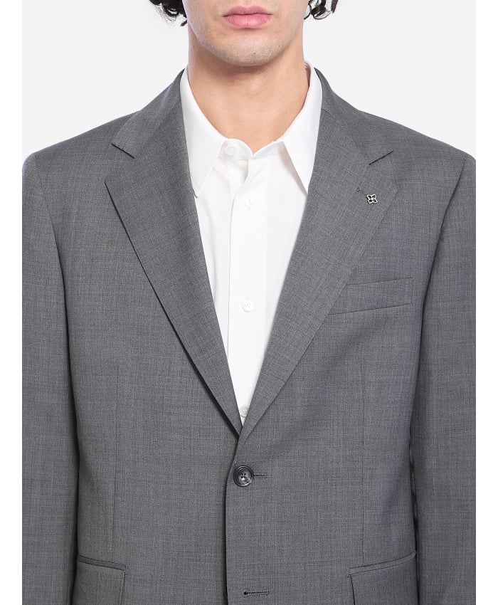 Two-piece suit in grey virgin wool. The jacket features a single-breasted design with classic lapels and a pin on the collar, front button closure,