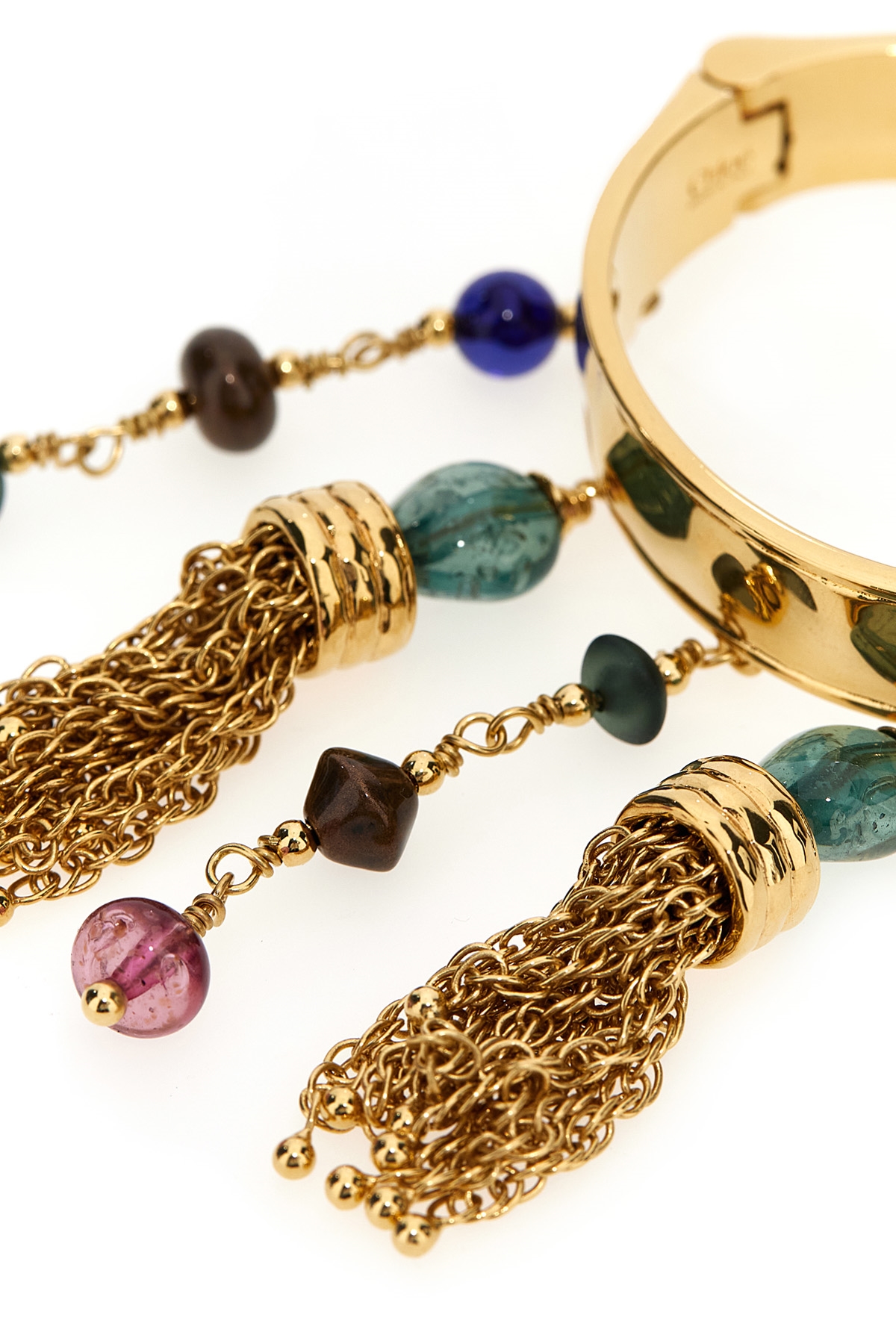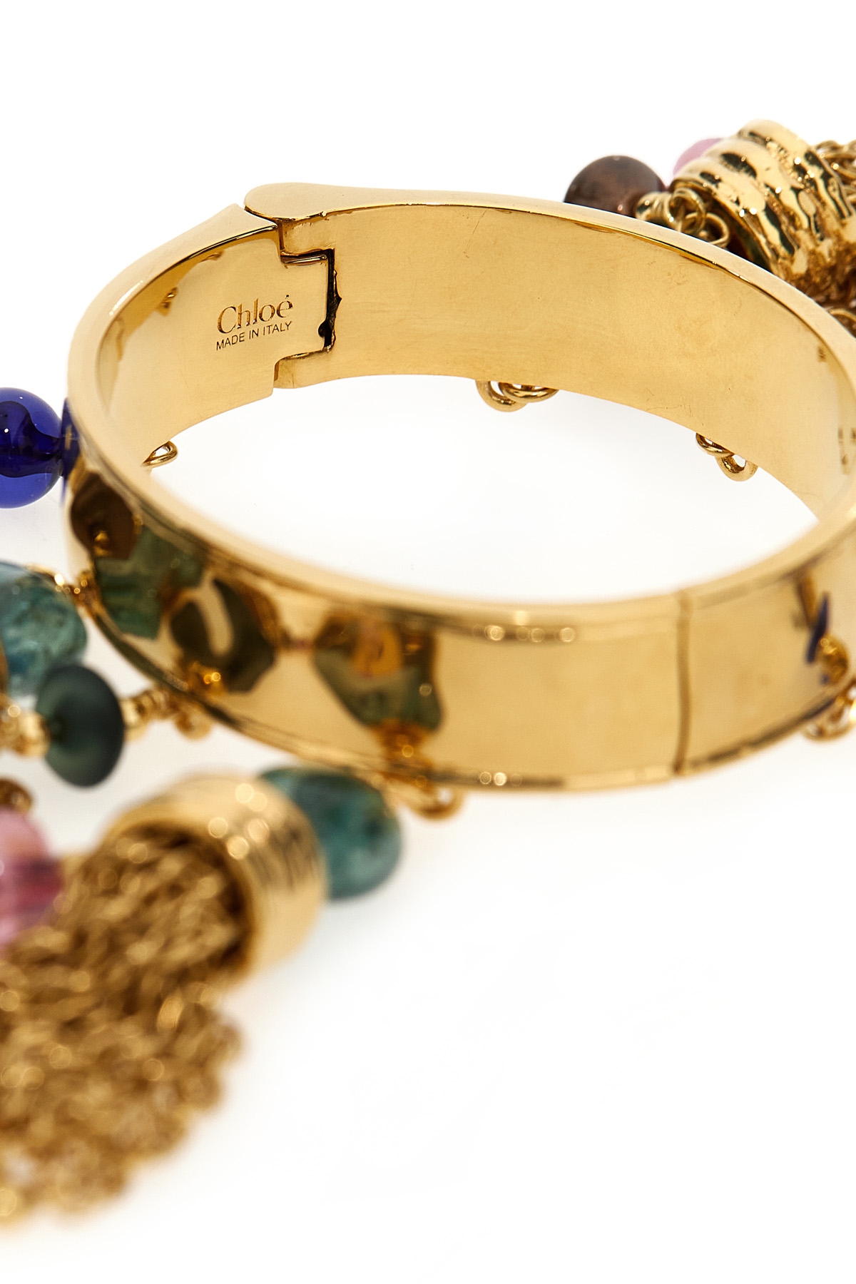 'Chloe Pompoms' bracelet in Vintage Gold brass with synthetic pearls and crystal glass, snap closure.