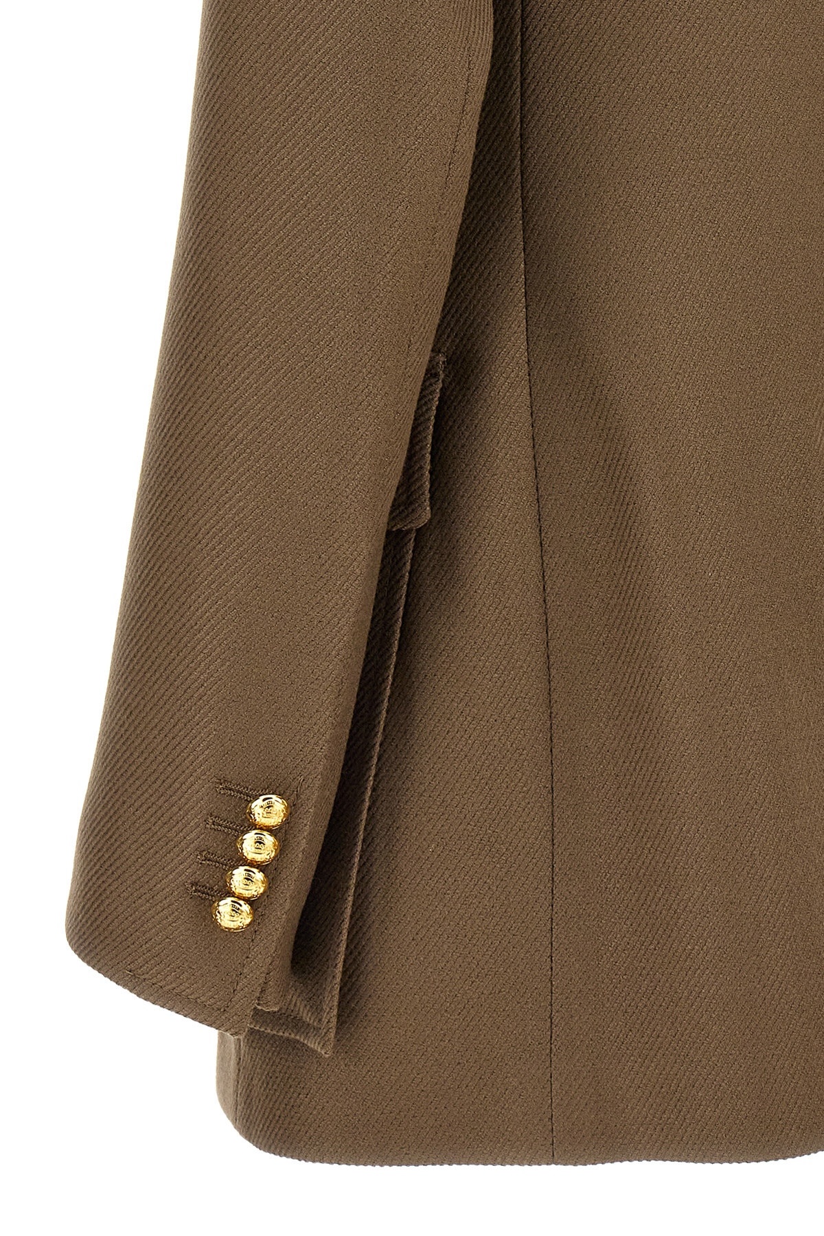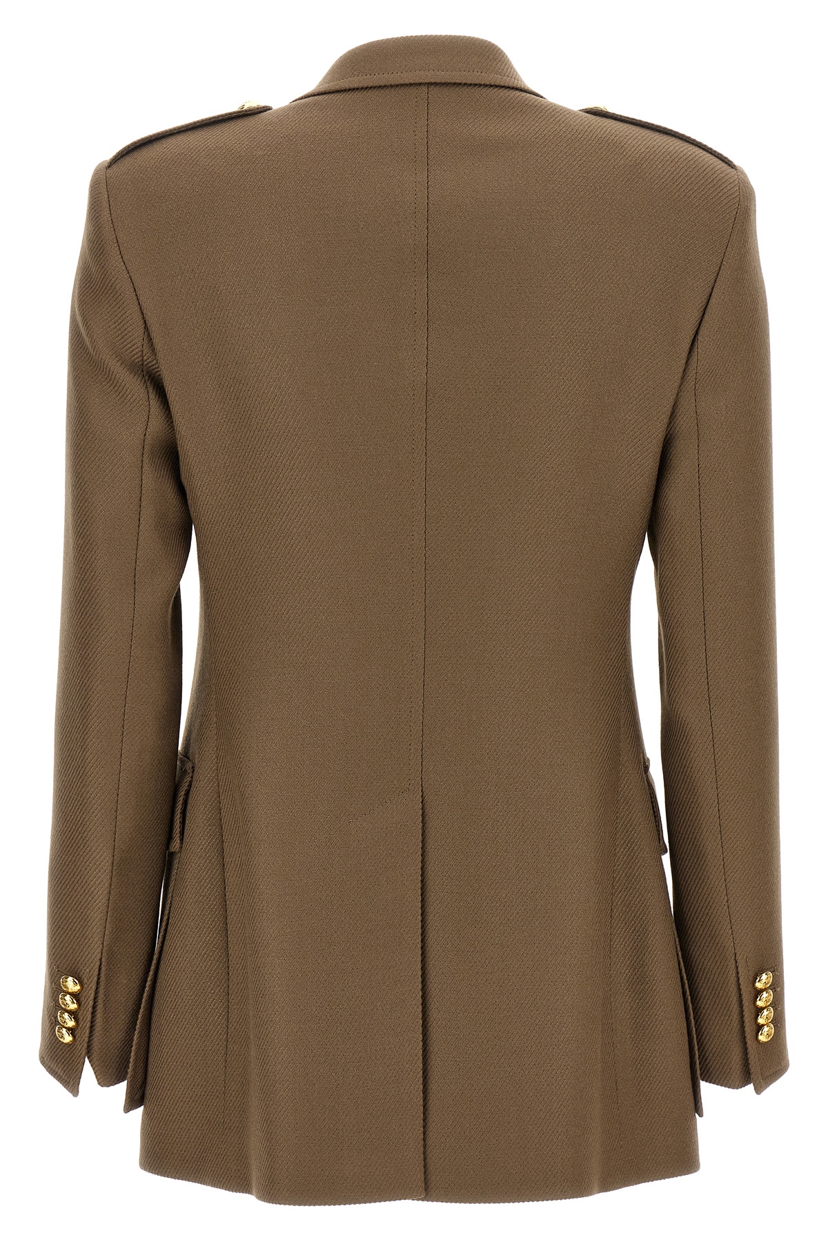 Single-breasted wool jacket with button closure, pockets, long sleeves, back split.