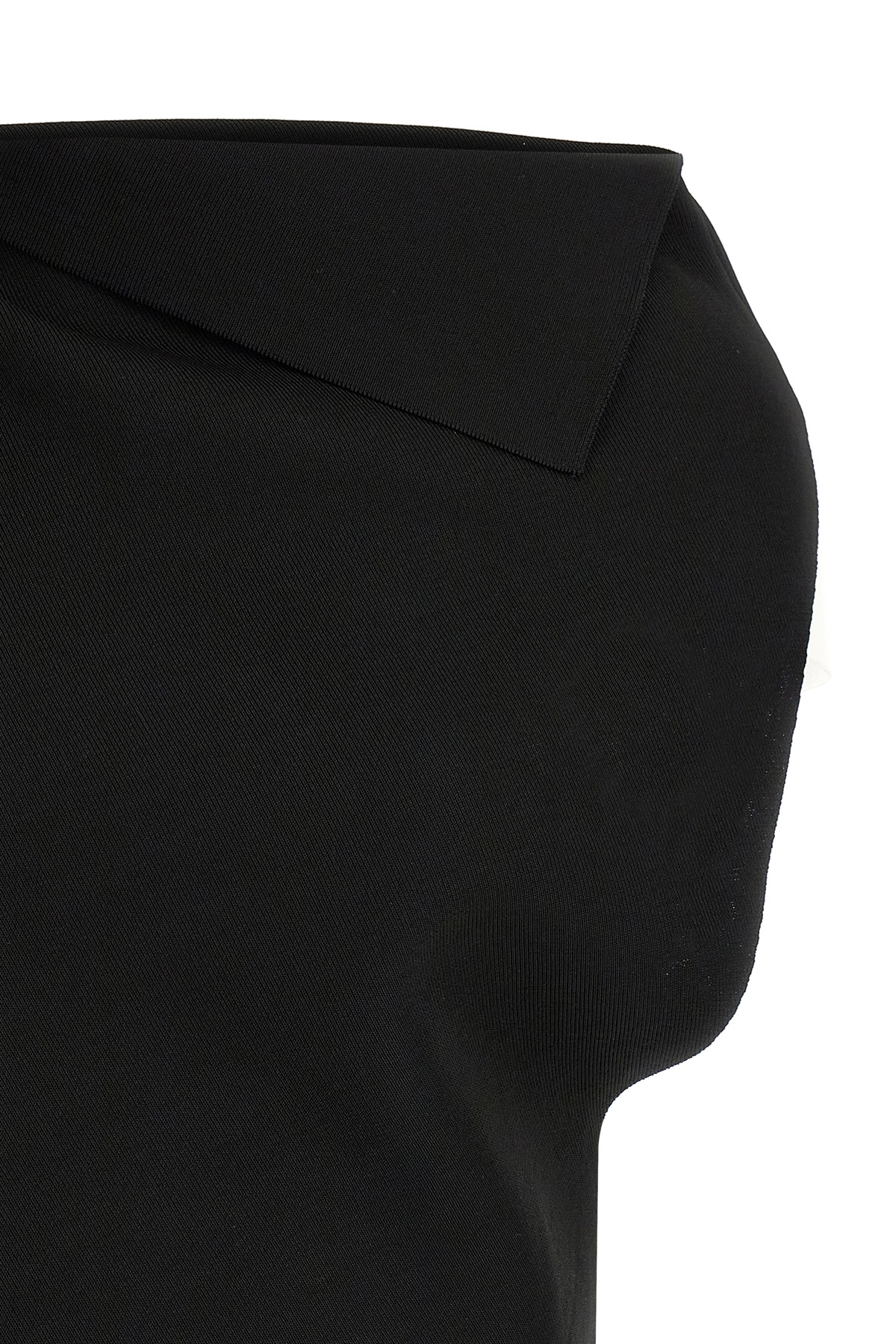 'La Maille Trapeze' 3D effect viscose knit top with asymmetrical and draped shape, boat neck, metal Rond-Carre brooch on the shoulder.