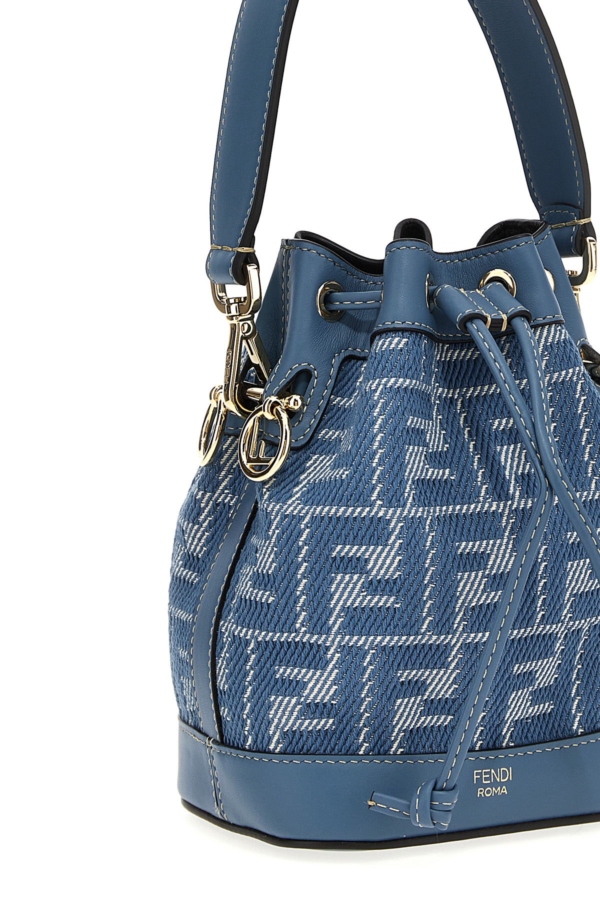 'Mon Tresor' mini handbag in FF jacquard with denim effect, metal and leather details, drawstring closure, removable handle, removable shoulder strap.