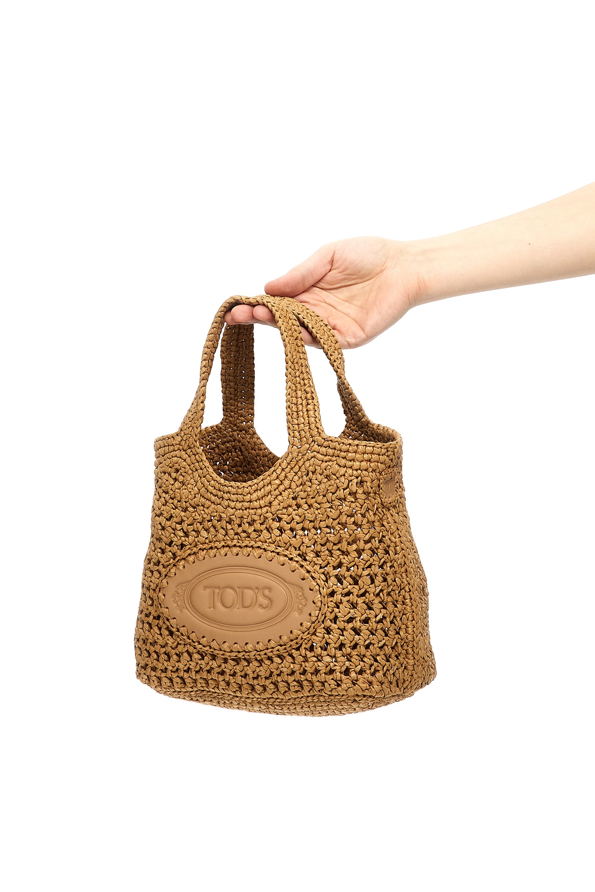Small viscose raffia shopping bag with handcrafted crochet processing, leather oval with embossed logo, double fixed handle, adjustable and removable leather shoulder strap.