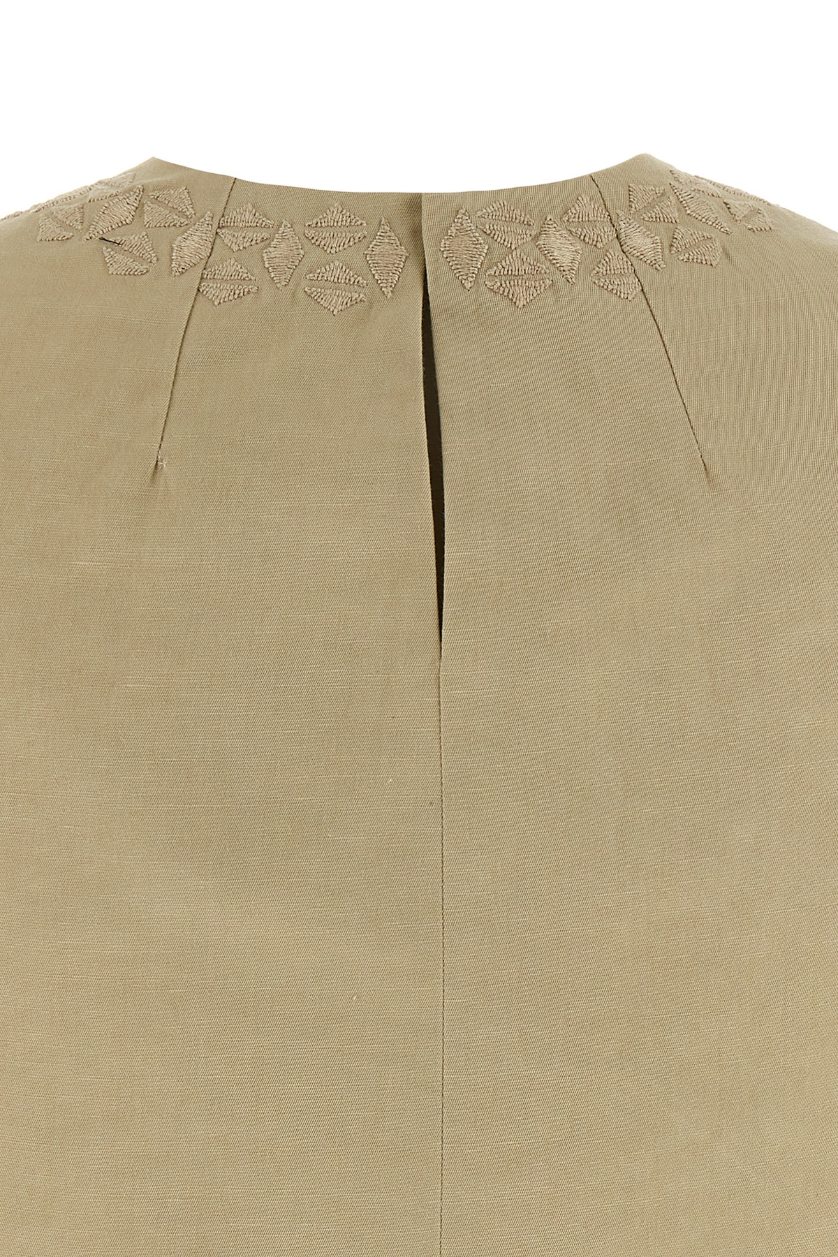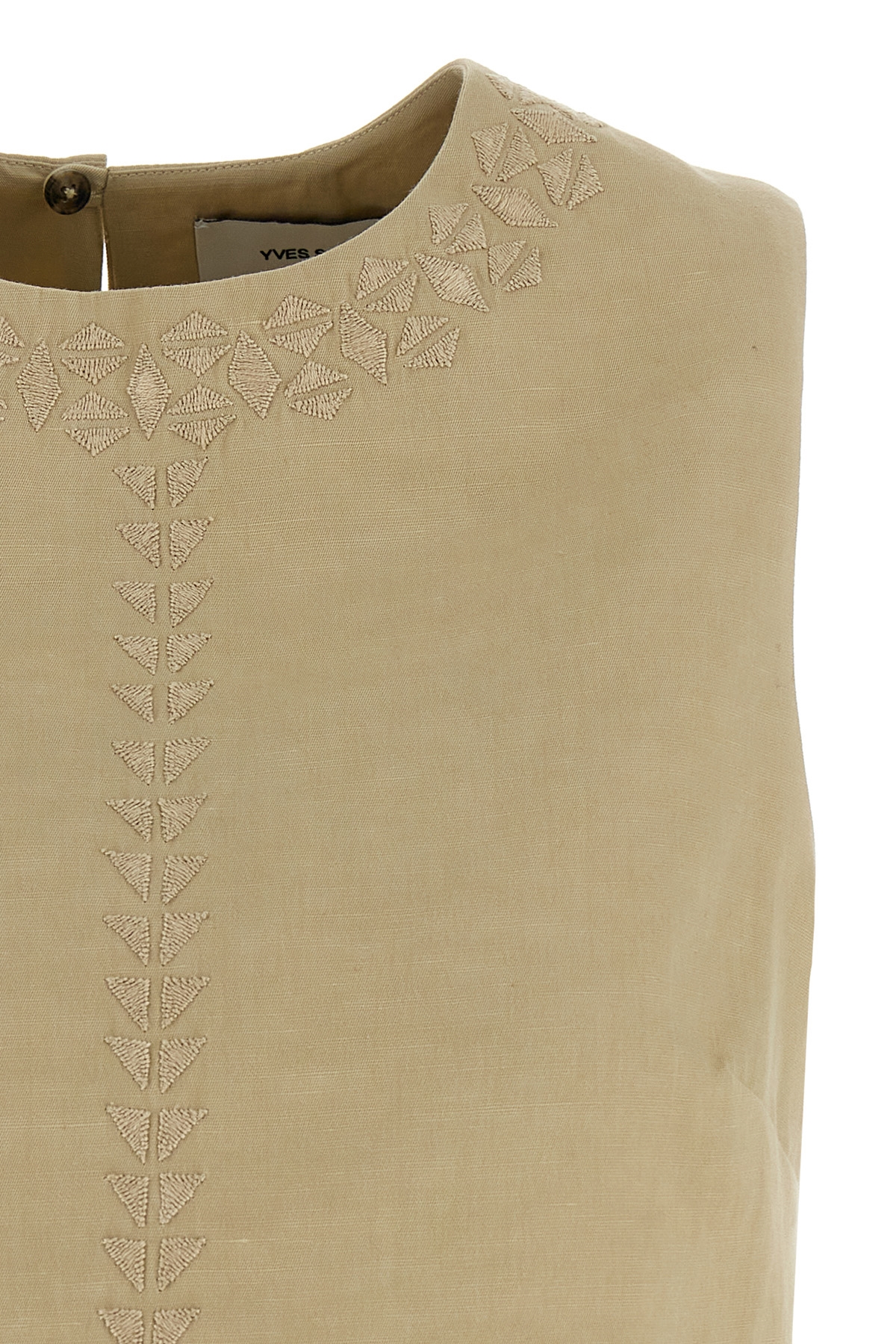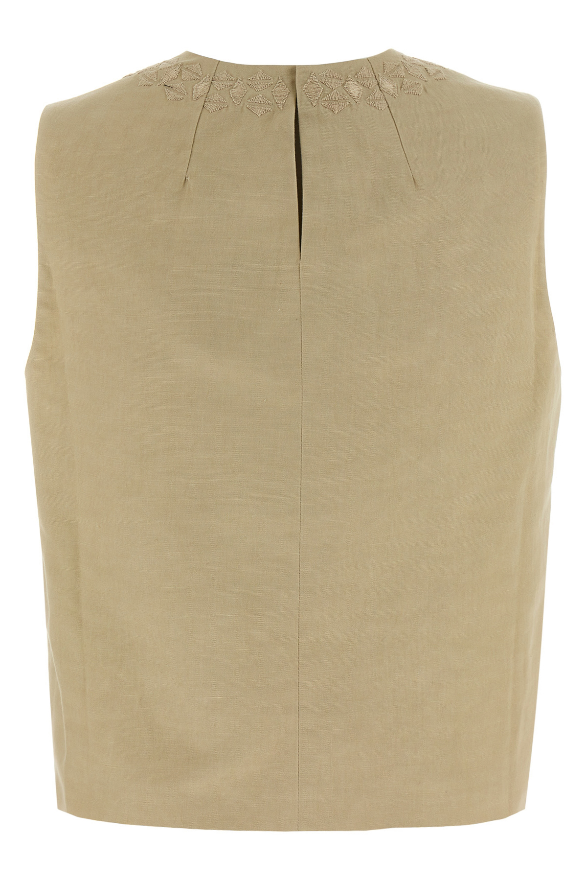 Cotton and linen blend top with tone-on-tone embroideries on the front and back, crew neck, back button closure with teardrop cut-out details.