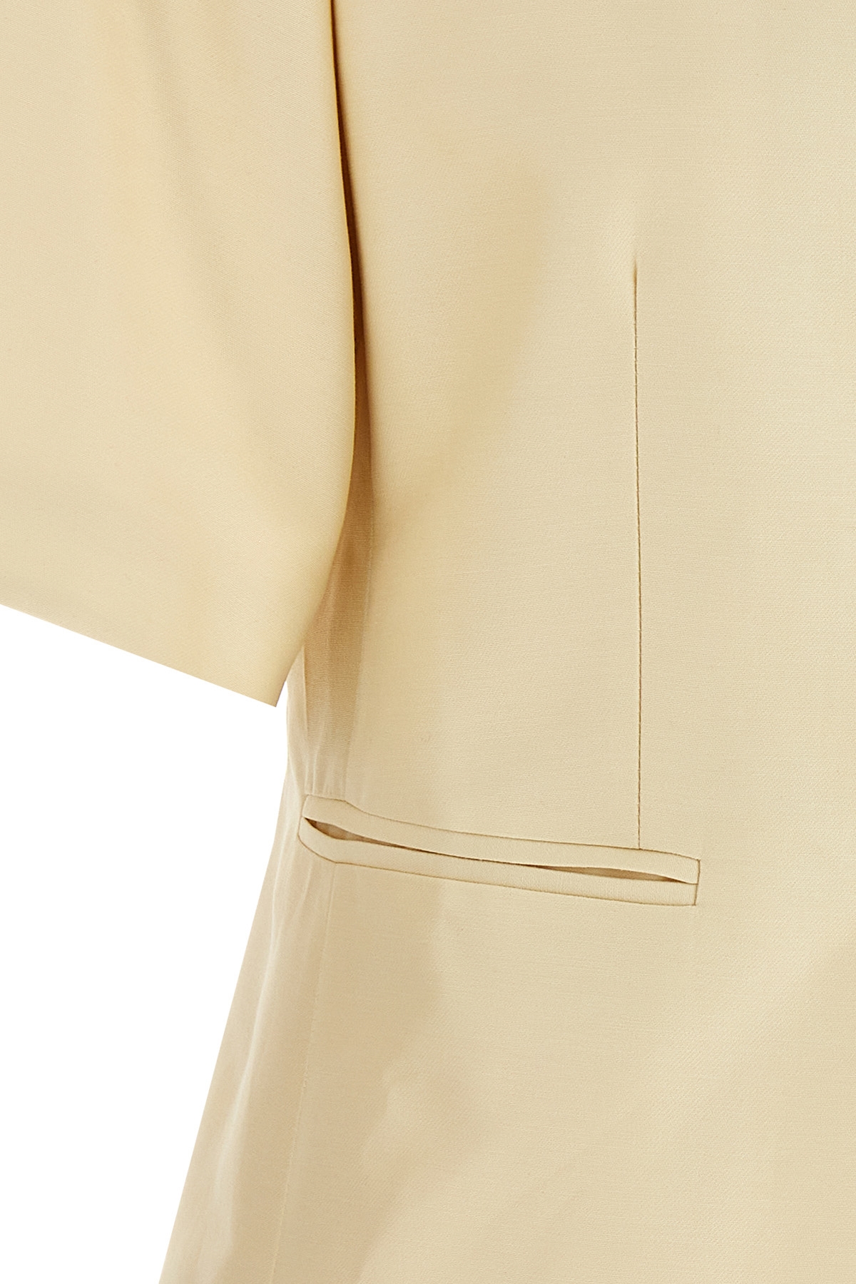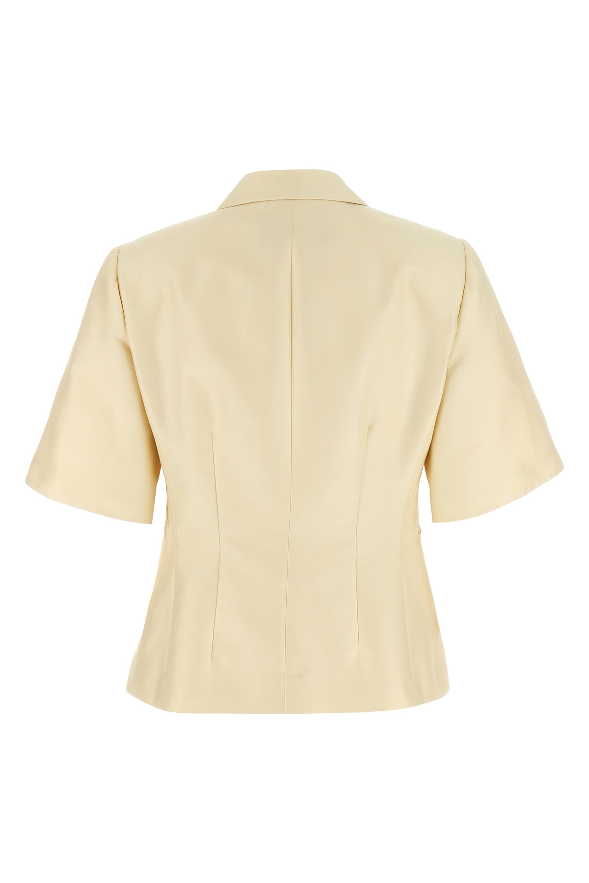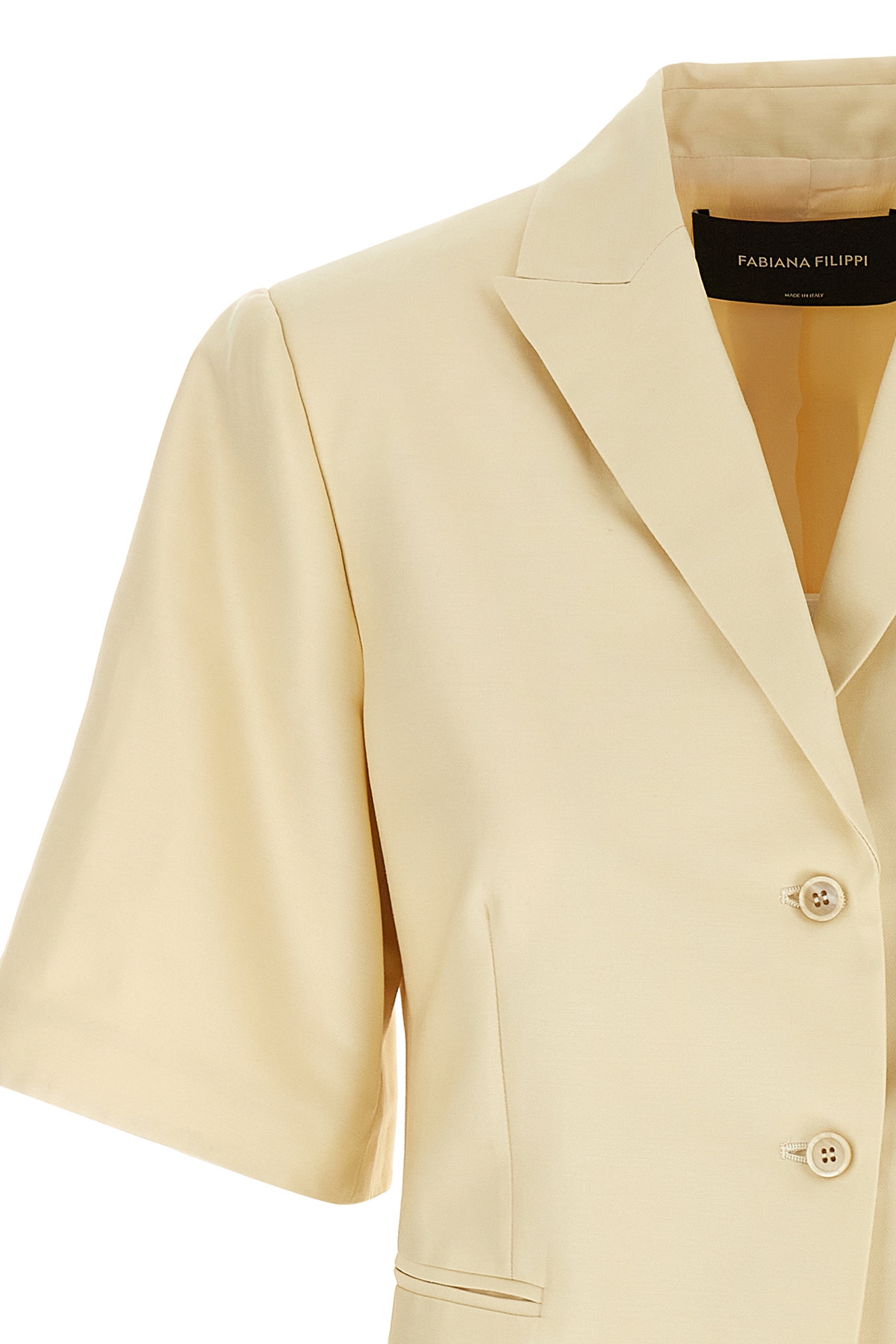 Mikado cotton and silk single-breasted blazer with front button closure, peak lapels, front and back pincer, lining, short sleeves, structured shoulder strap, pockets.
