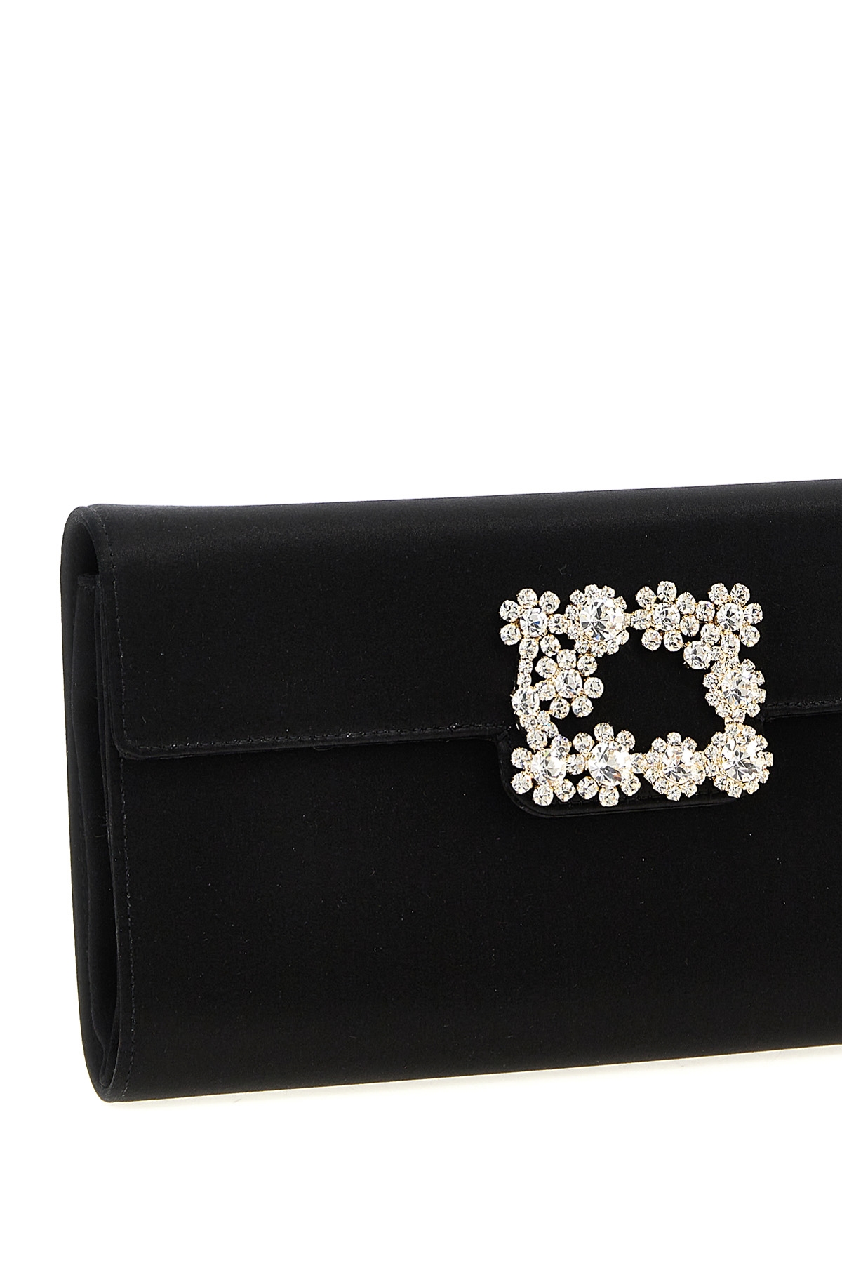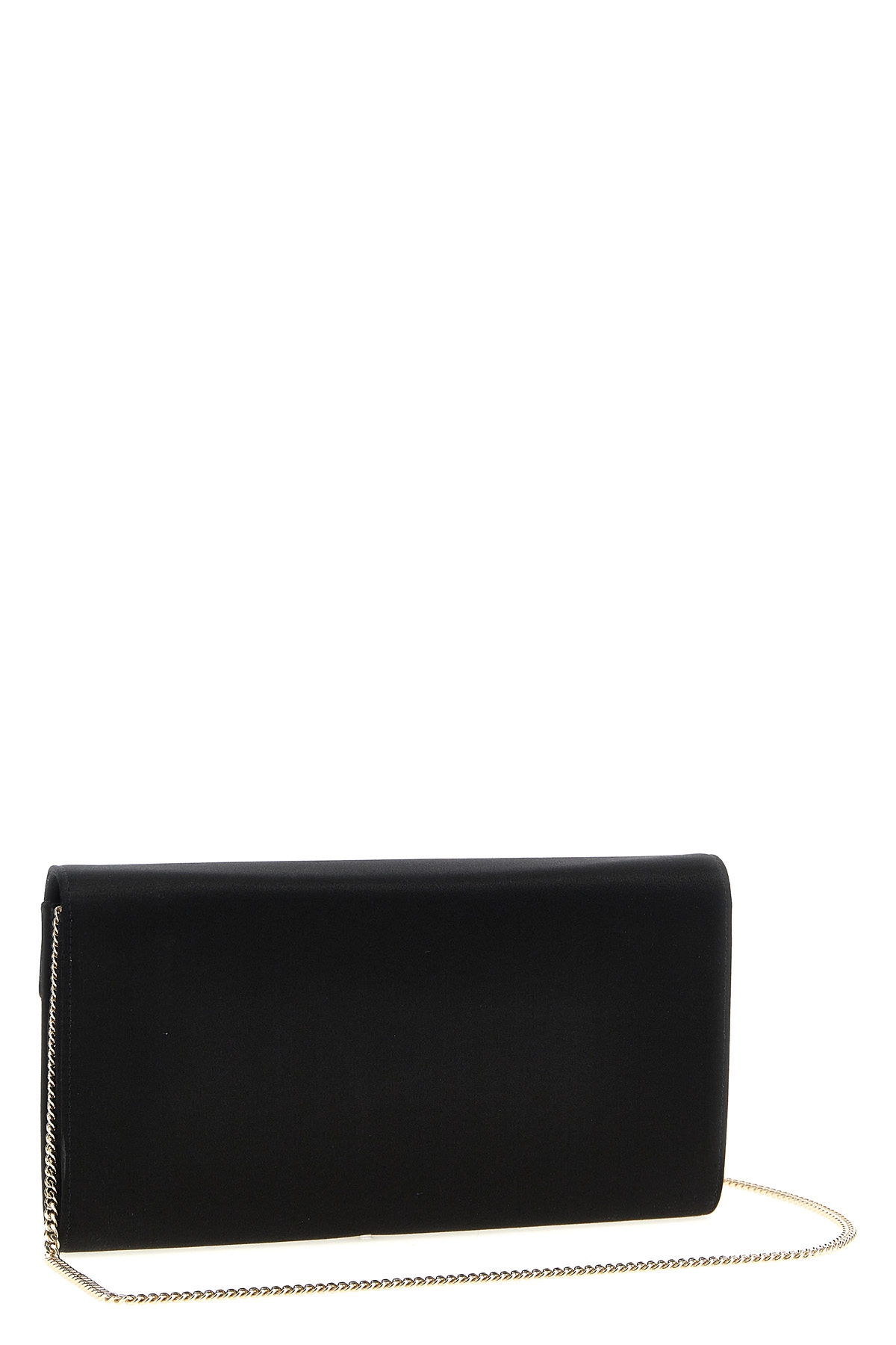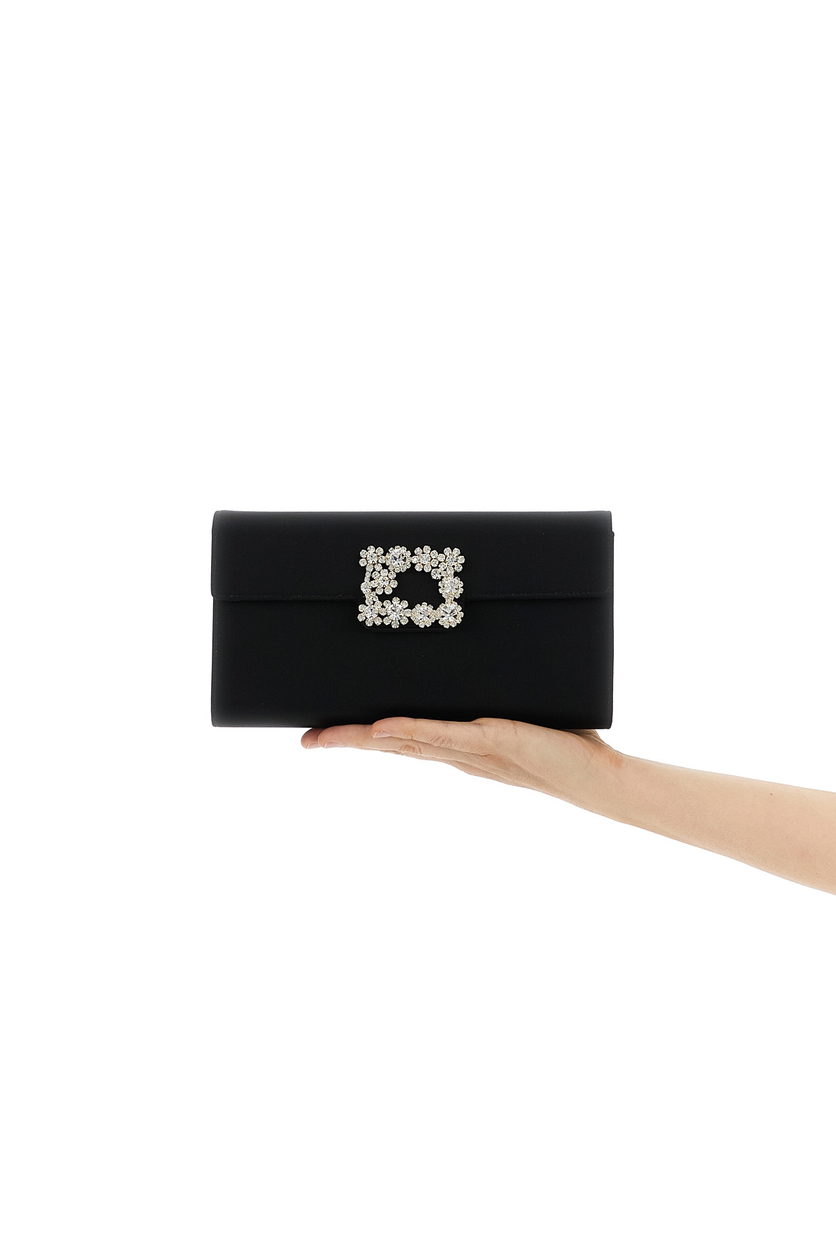 'Efflorescence' satin clutch, snap flap closure with front jewel buckle application, sliding chain shoulder strap.