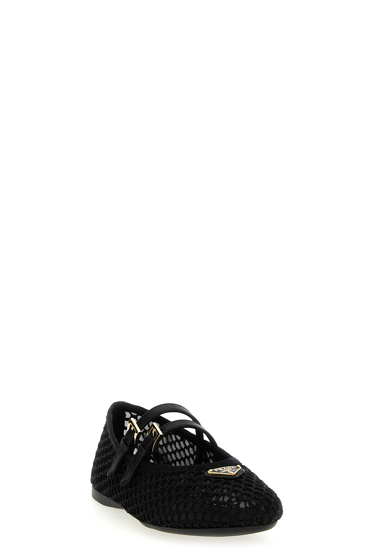 Mesh ballet flats with macrame processing superimposed on the mesh fabric, double adjustable leather strap, front enameled metal triangle logo, rubber sole.