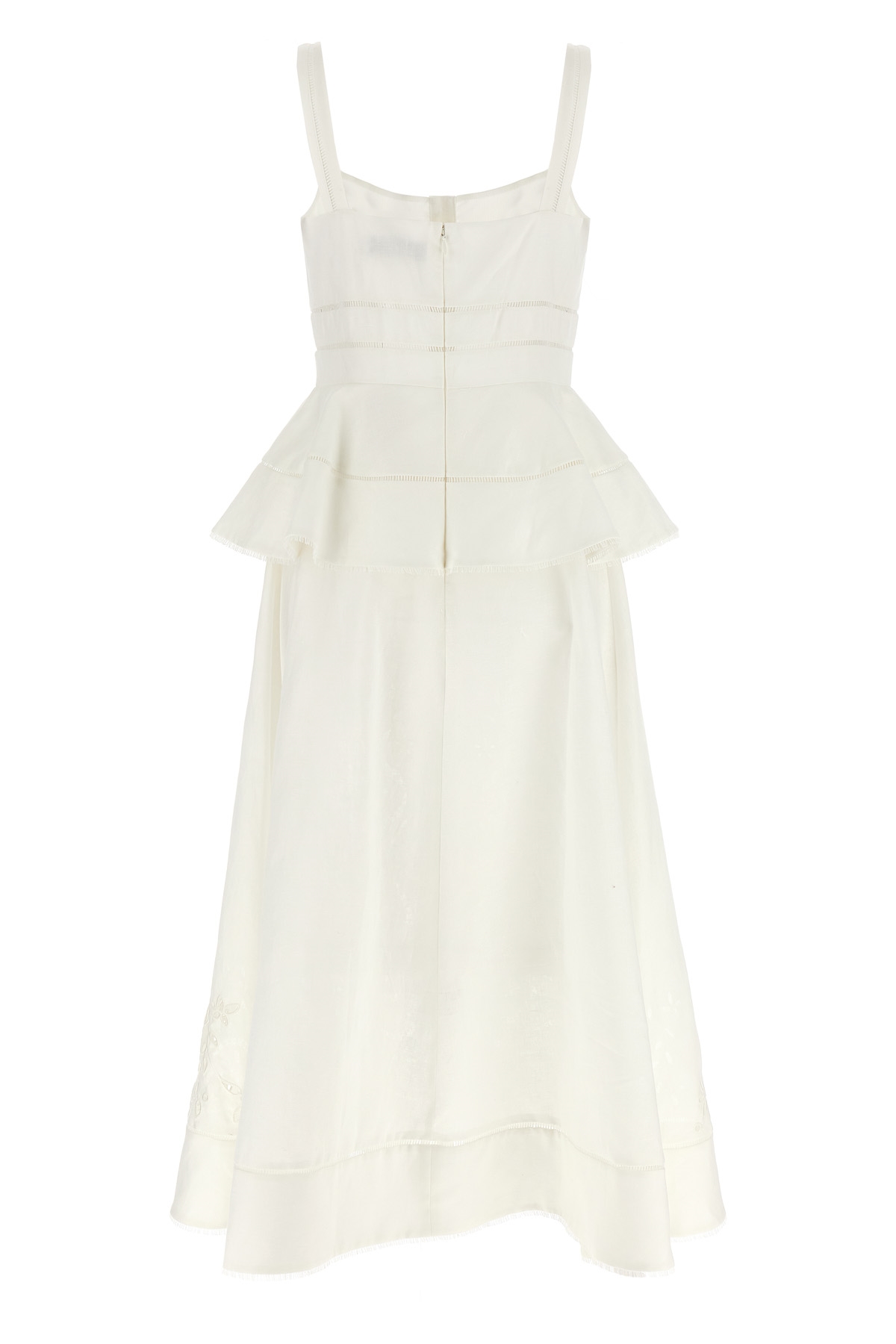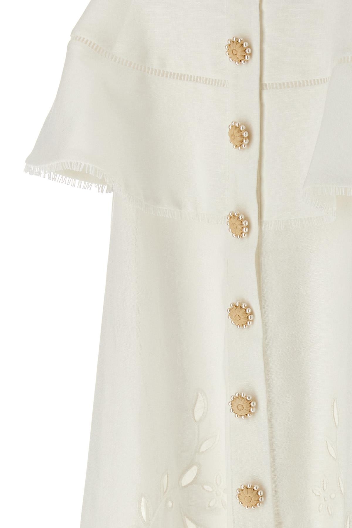 'Cream Linen Peplum Midi' linen dress with perforated details and in sangallo, model with peplos at the waist and flared skirt, unlined, sleeveless, straight neckline, front trompe l'oeil button closure, back zip closure.