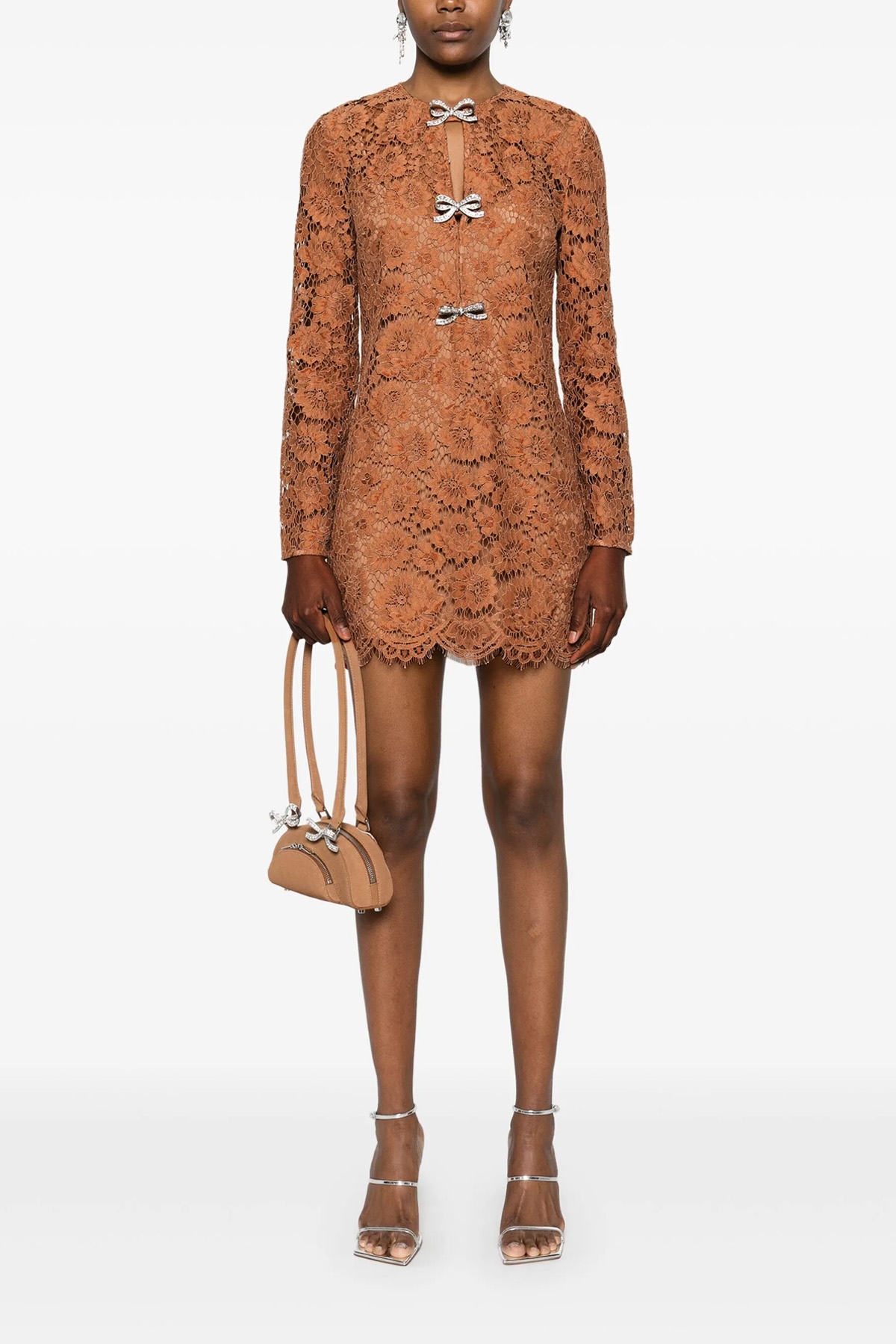 Tan Lace Bow Mini' lace dress with jewel details and front cut-outs, long sleeves, back zip closure, removable petticoat with adjustable straps.