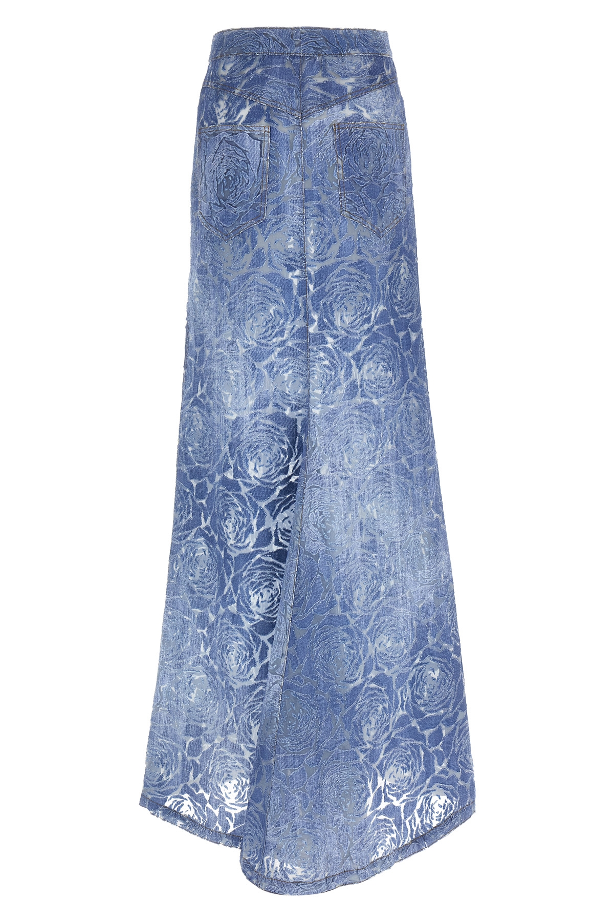 Maxi denim skirt with floral pattern made with devore technique, zip and front button closure, pockets.