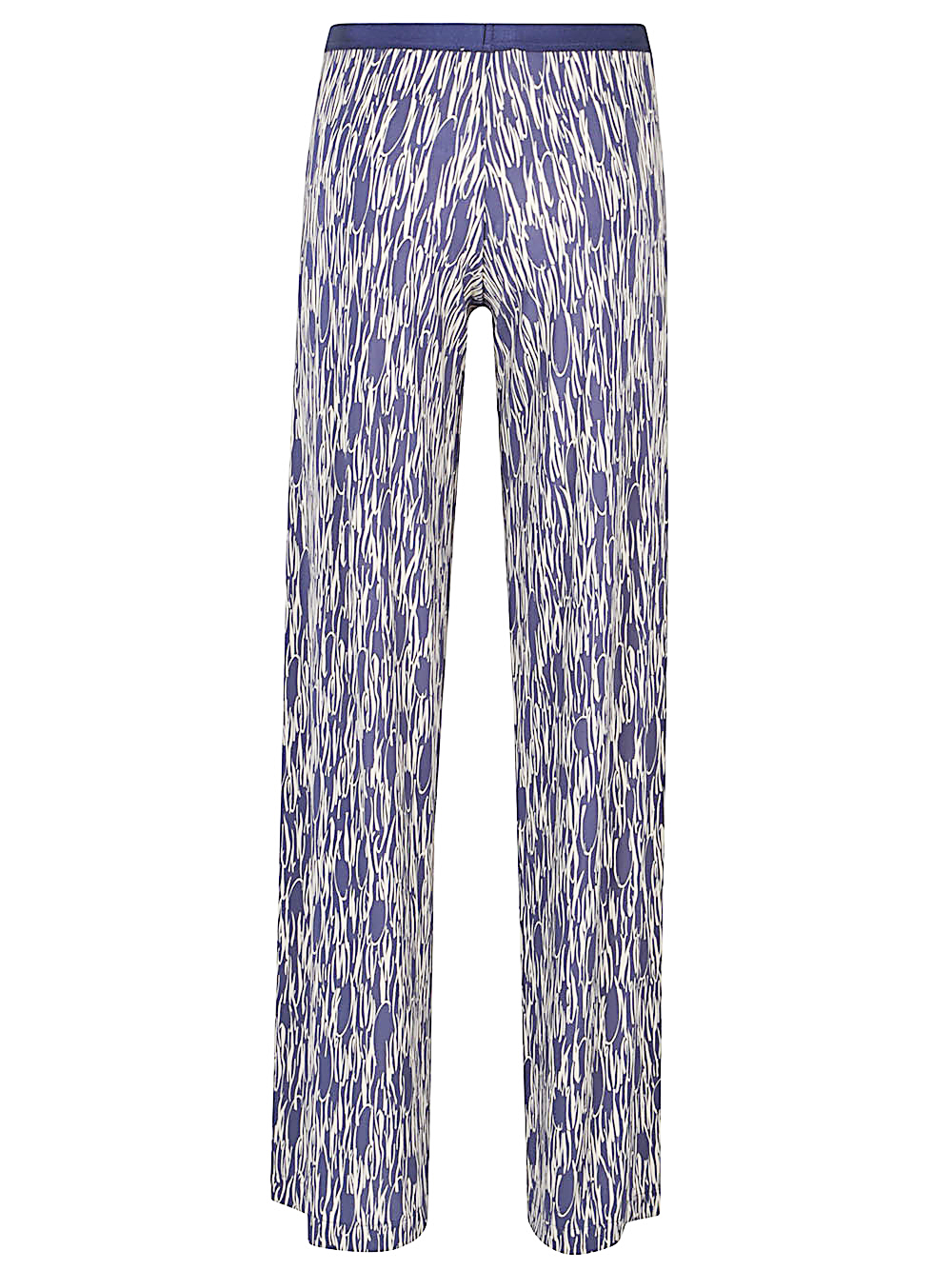 Palazzo trousers with all-over multicolor print, elastic waist, no pockets, straight hem.