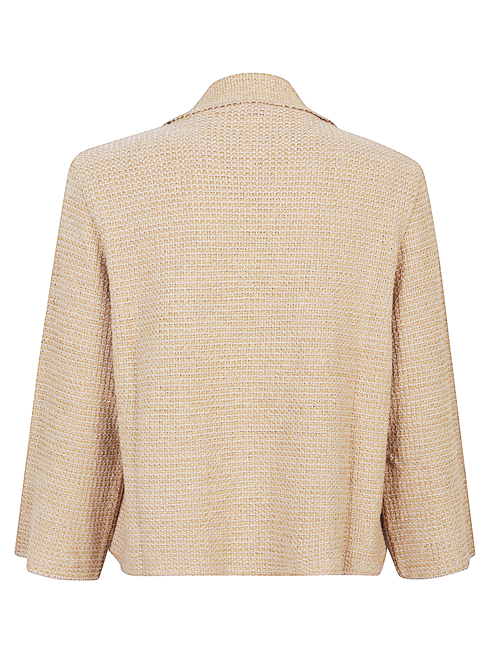 Beige jacket, long sleeves, without buttons, open, straight hem.
